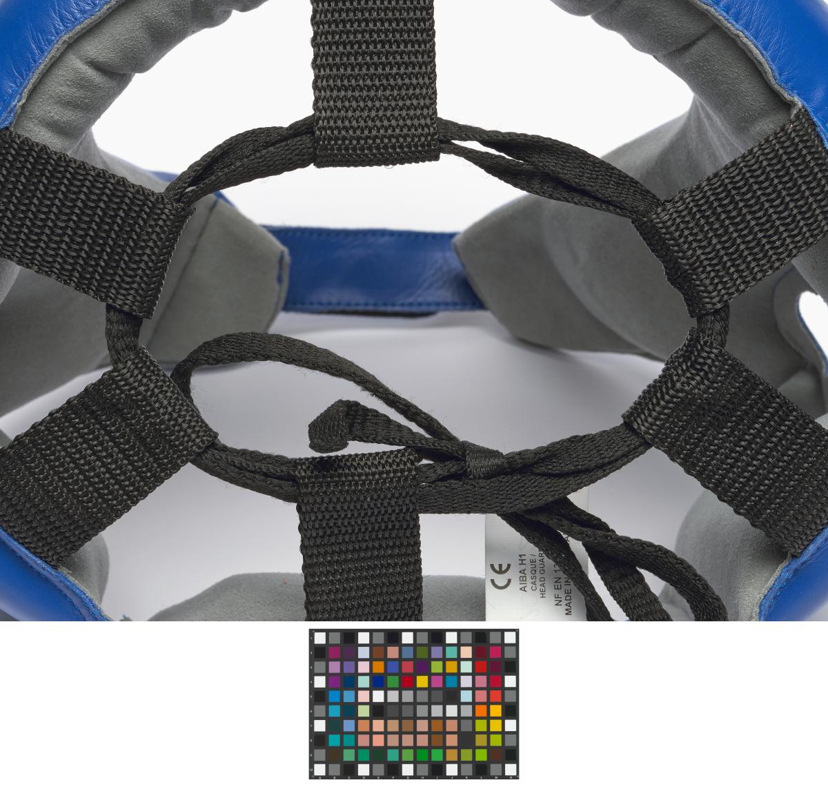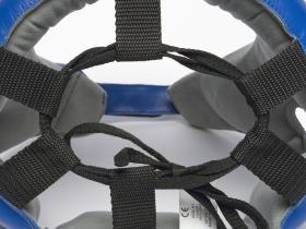 Casque en peau de vache doublé en Amara gris, avec des renforts en mousse Air Cushion et une fermeture à double velcro. Taille L. Approuvé par la Fédération Internationale AIBA.