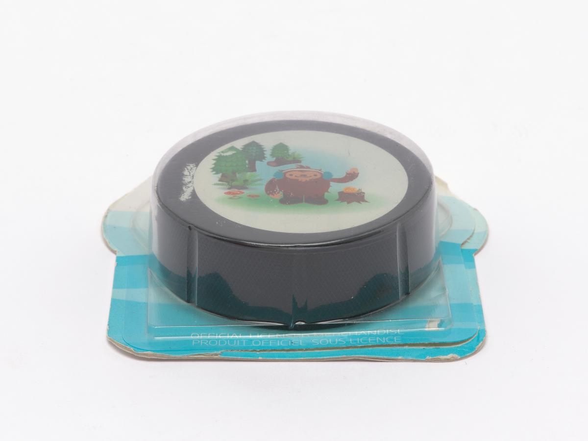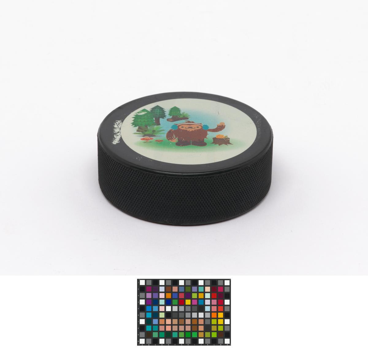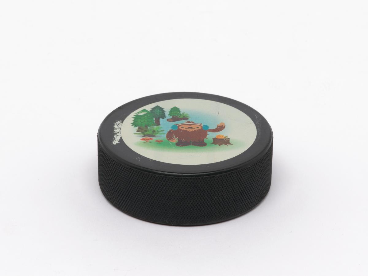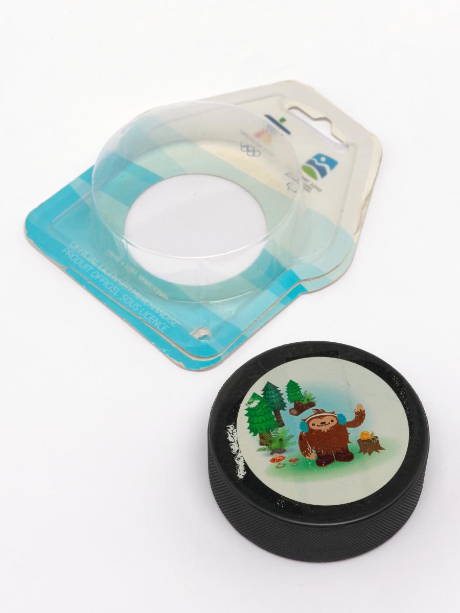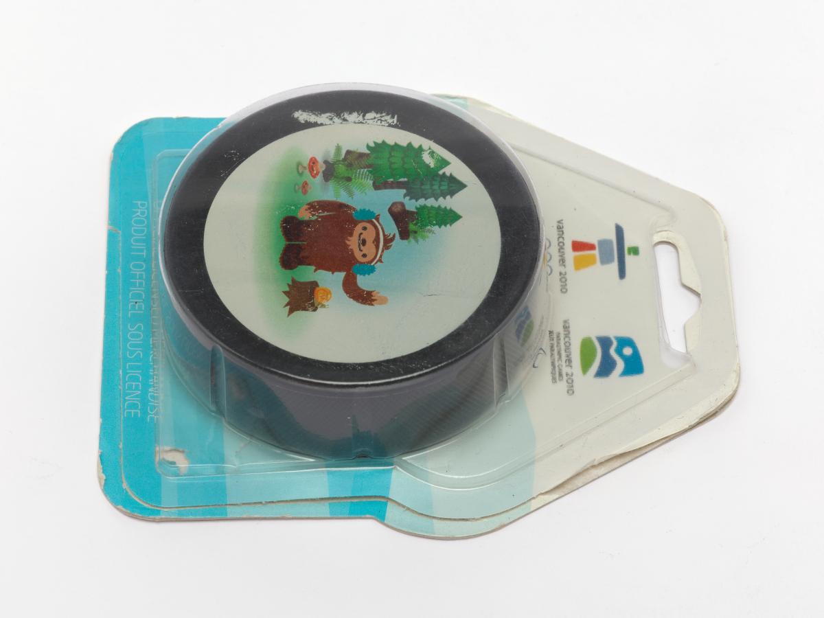 Vancouver 2010, palet de hockey sur glace avec Quatchi, une des mascottes des Jeux.