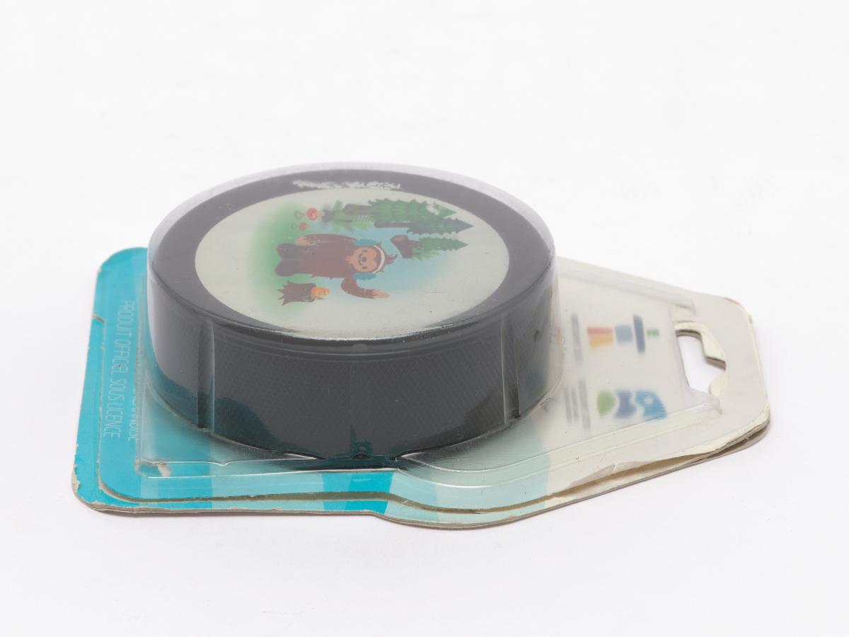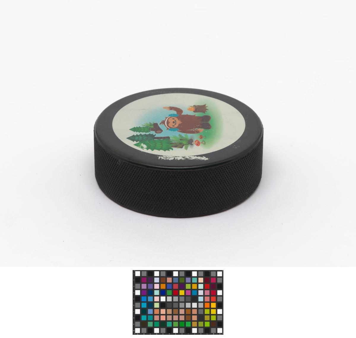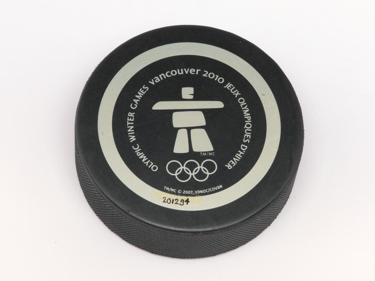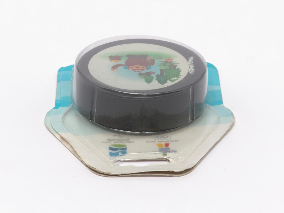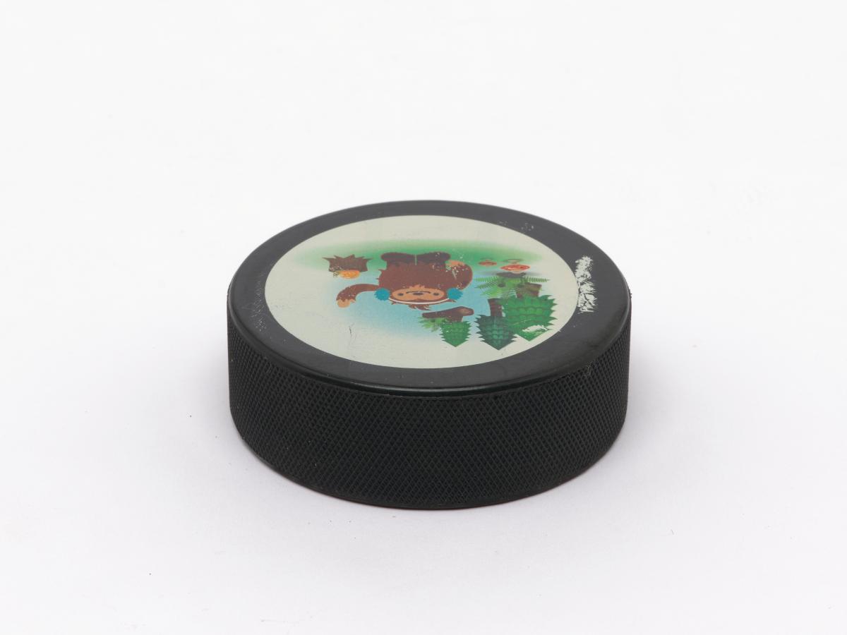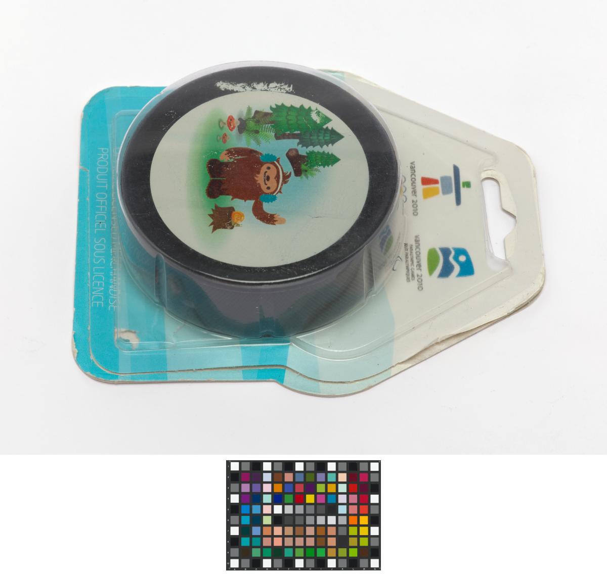 Vancouver 2010, palet de hockey sur glace avec Quatchi, une des mascottes des Jeux.
