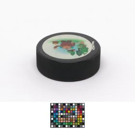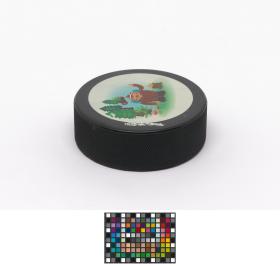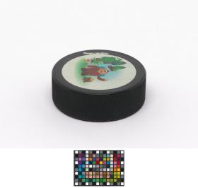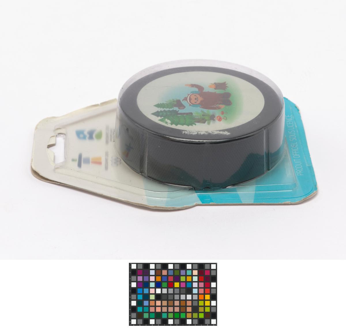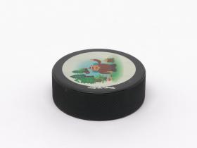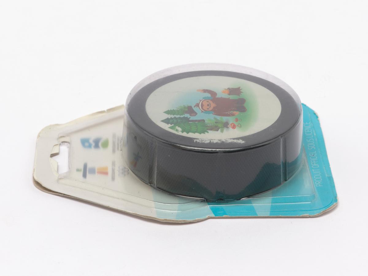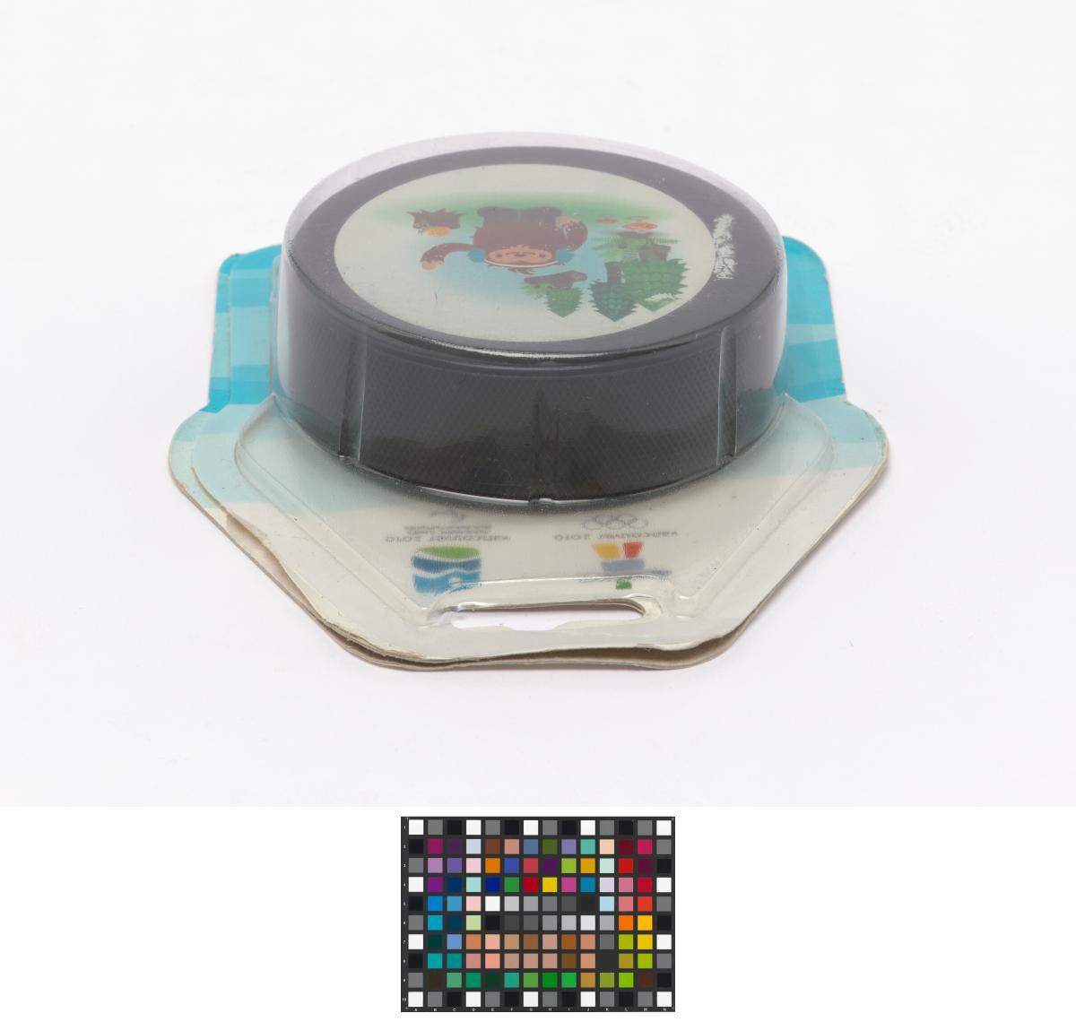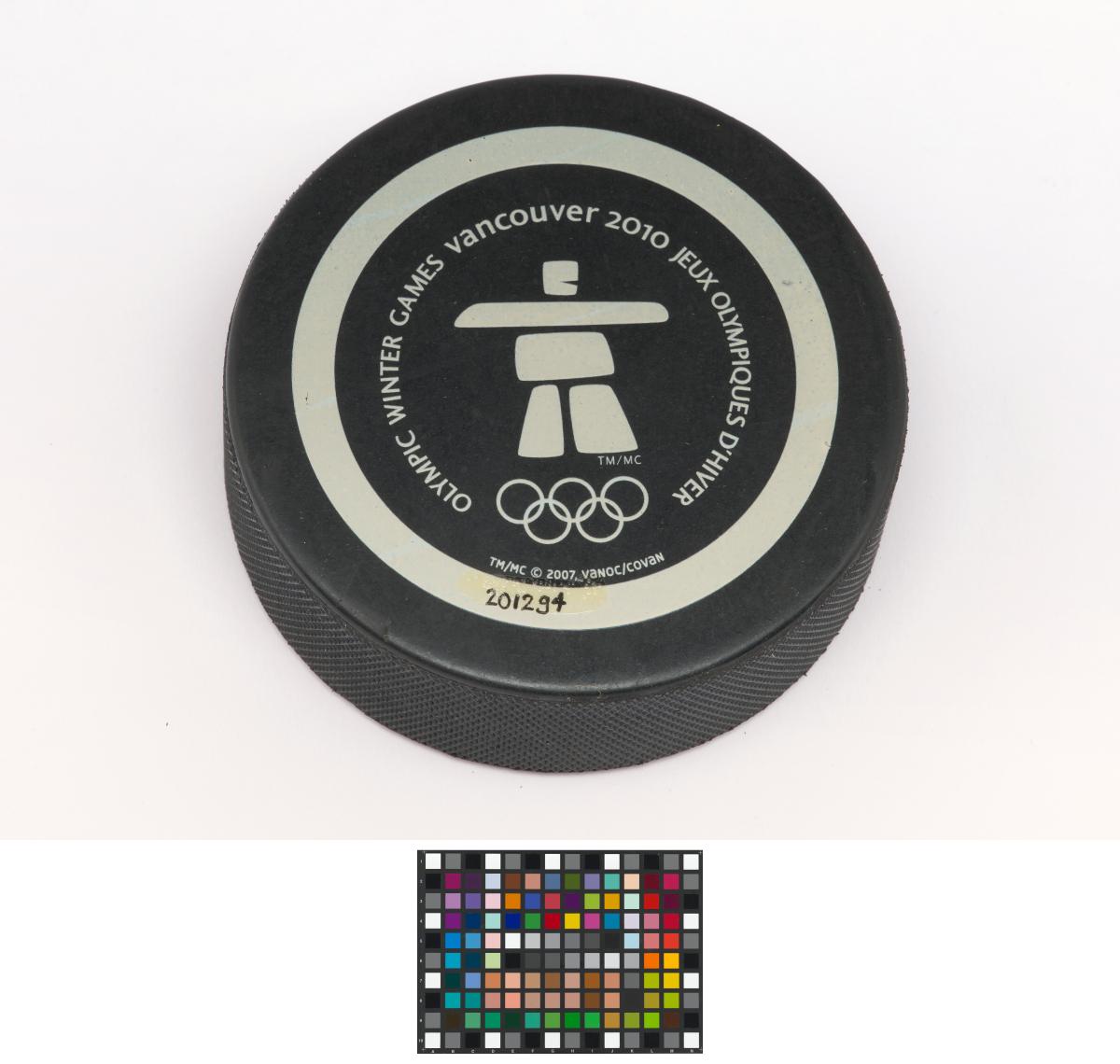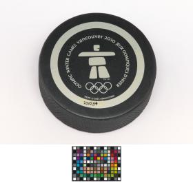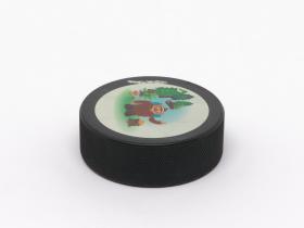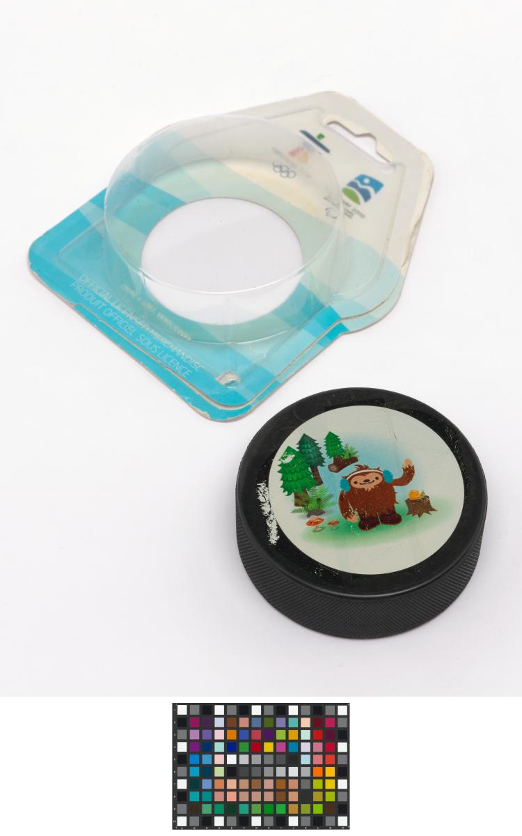 Vancouver 2010, palet de hockey sur glace avec Quatchi, une des mascottes des Jeux.
