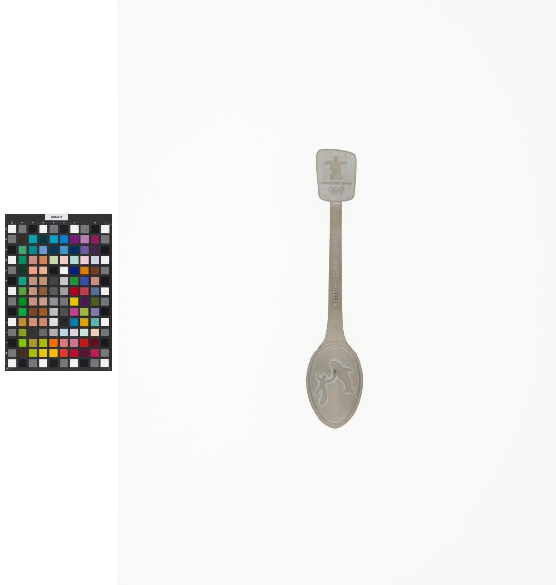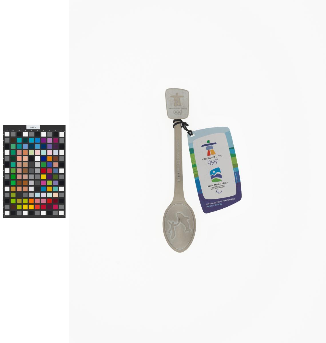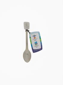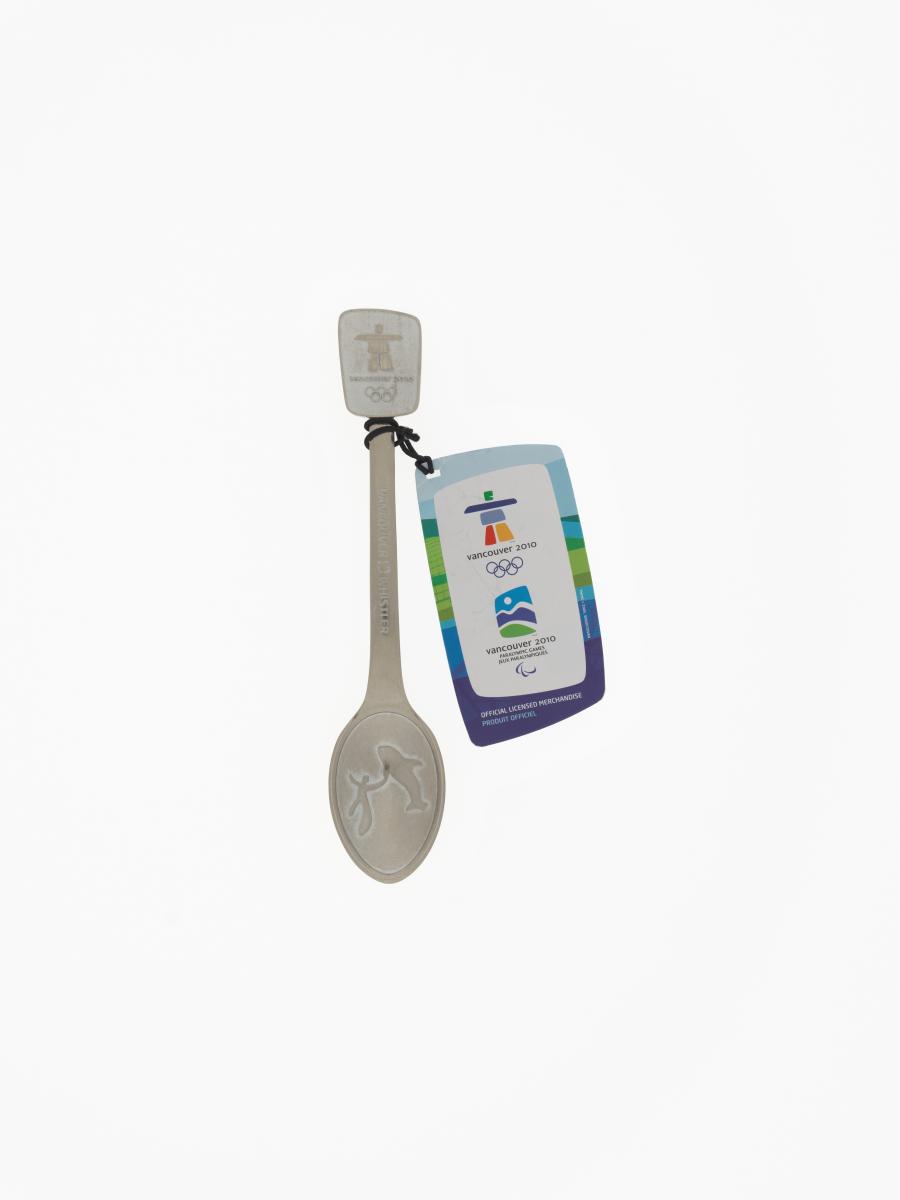 Le logo des Jeux sur le dessus et un homme et un épaulard sur la cuillère. Lég.: "Vancouver Whistler" avec une feuille d'érable? entre les 2 localités.