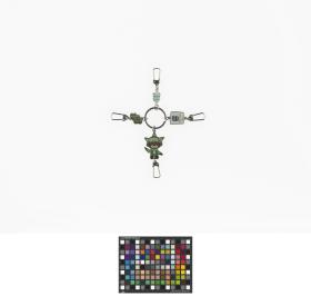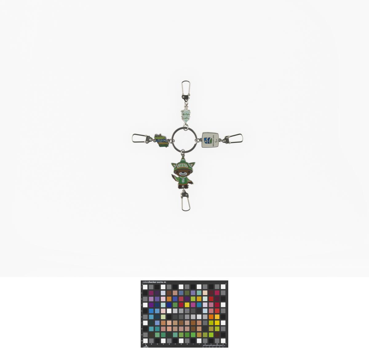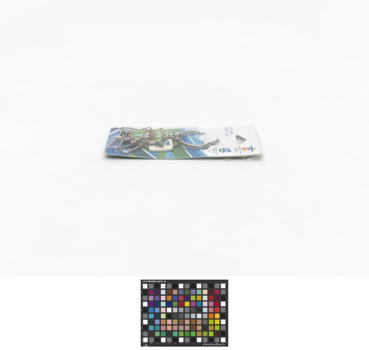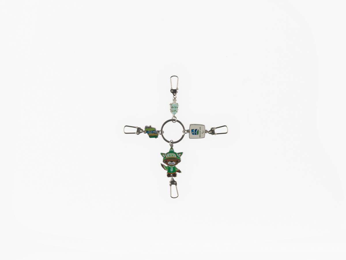 Vancouver 2010, porte-clé en métal avec pendentifs représentant Sumi, l'emblème des Jeux Paralympiques, un sapin et un râtelier à ski.