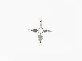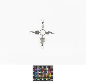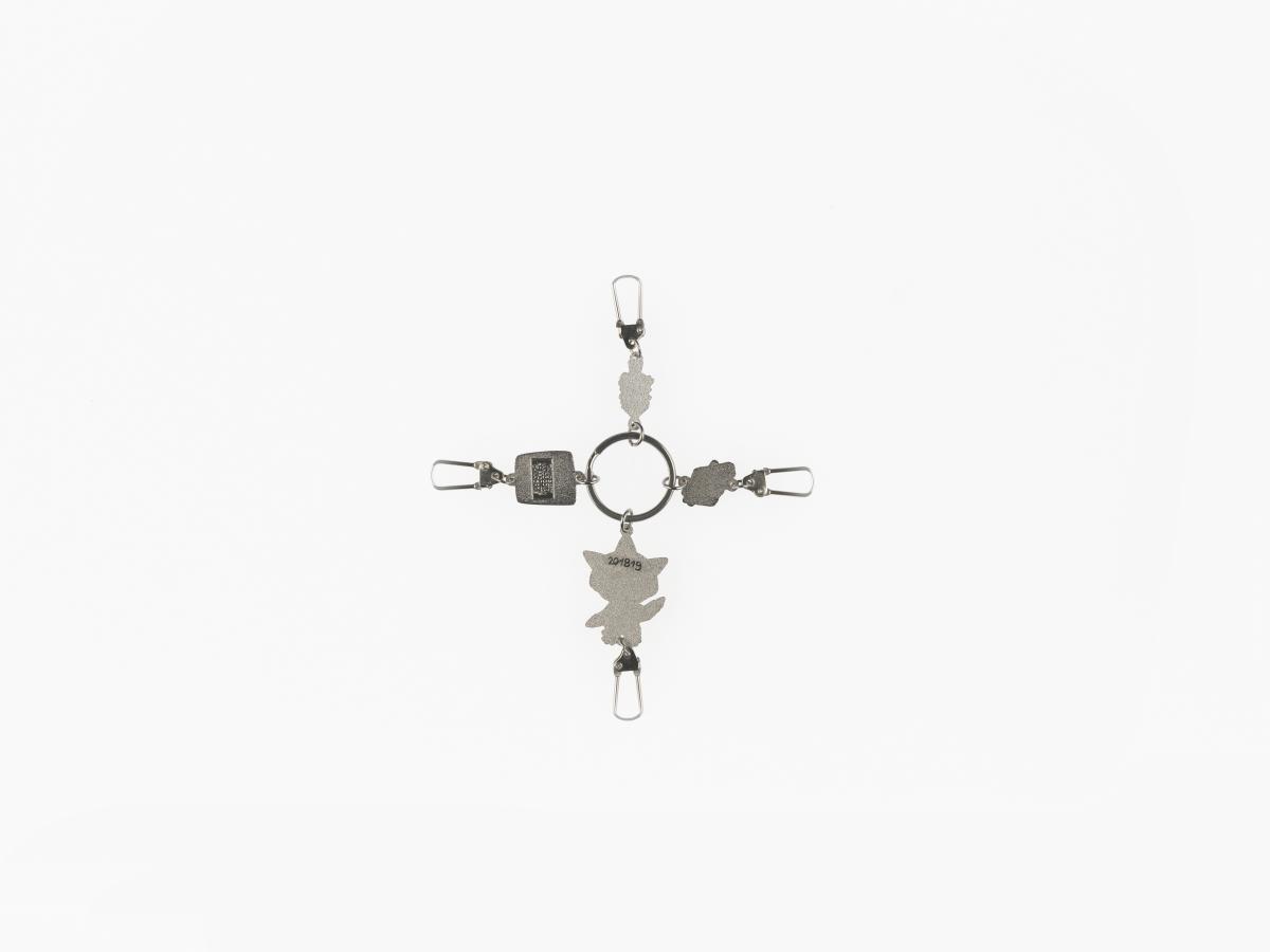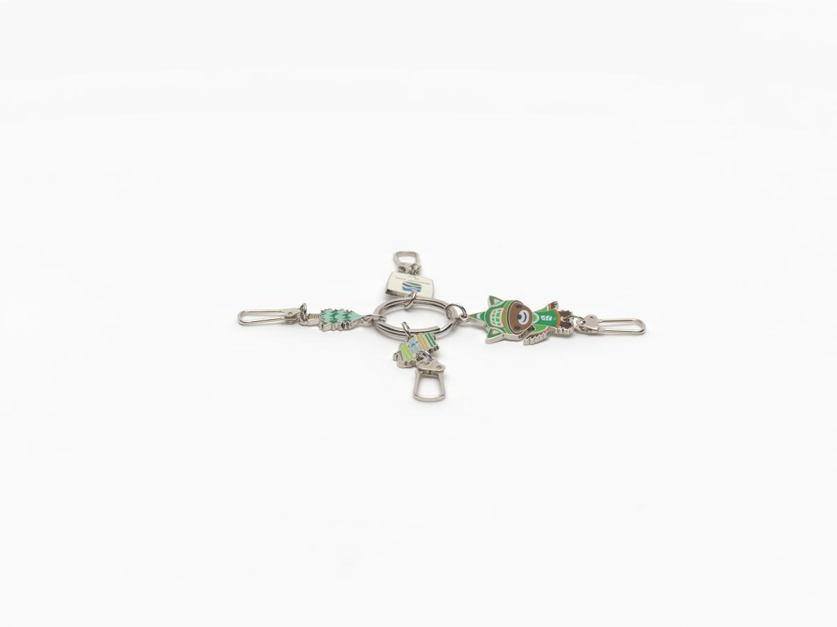 Porte-clé en métal avec pendentifs représentant Sumi, l'emblème des Jeux Paralympique, un sapin et râtelier à ski