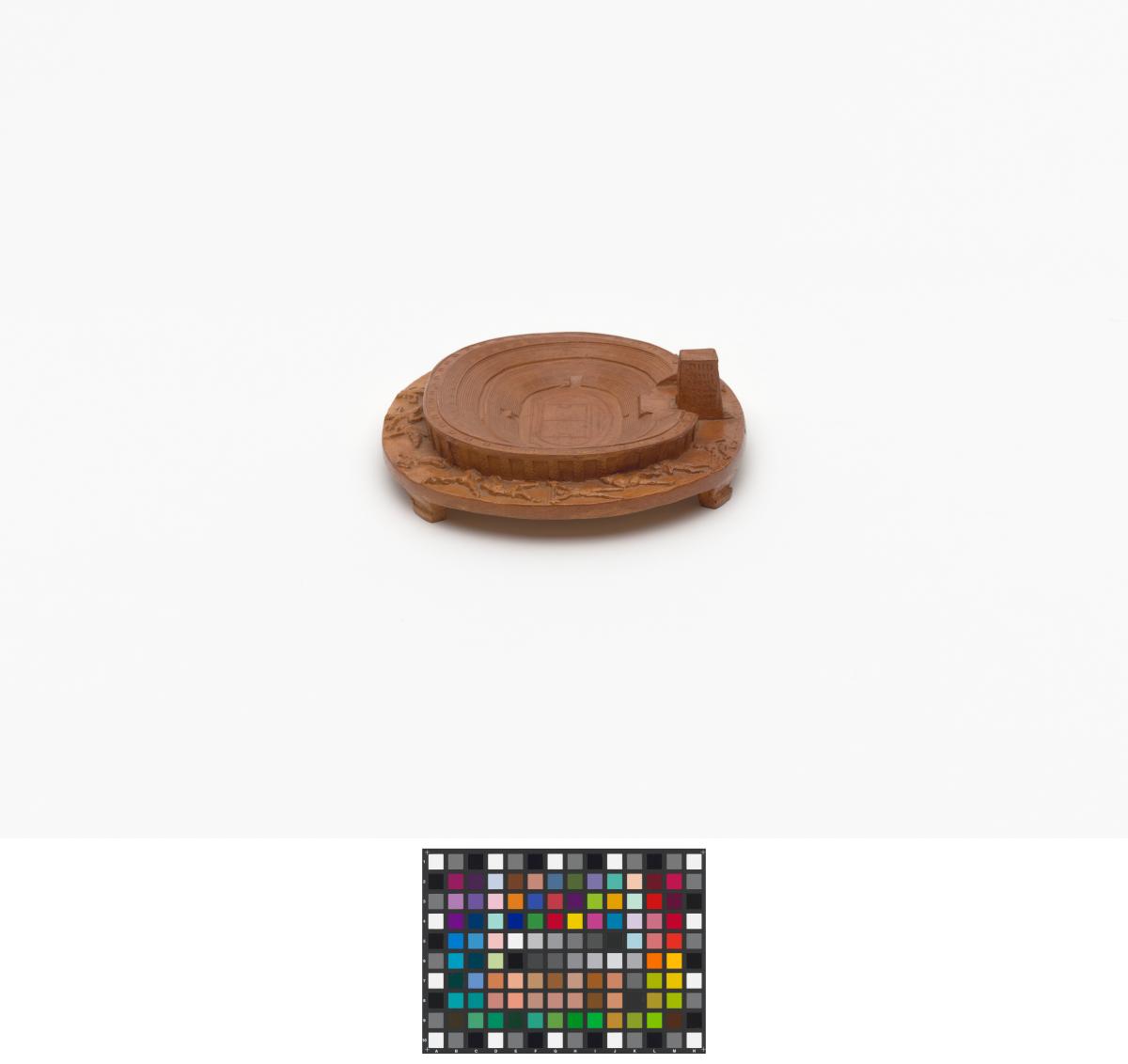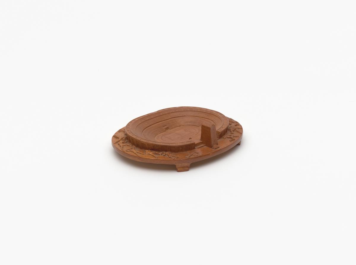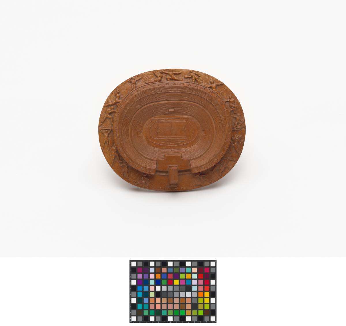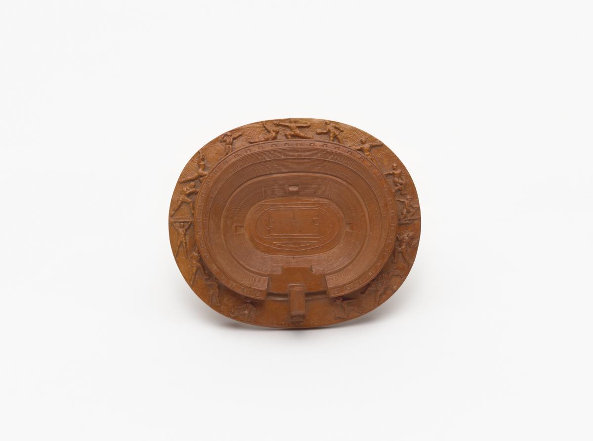 Maquette de taille réduite en terre cuite du Stade du Peuple (Népstadion en hongrois), entouré de scènes sportives. Timbre "Turkovi LANC Makbi (?)". Ecrin original.