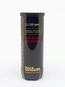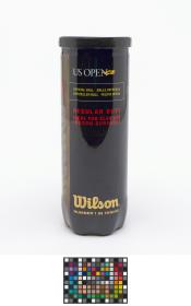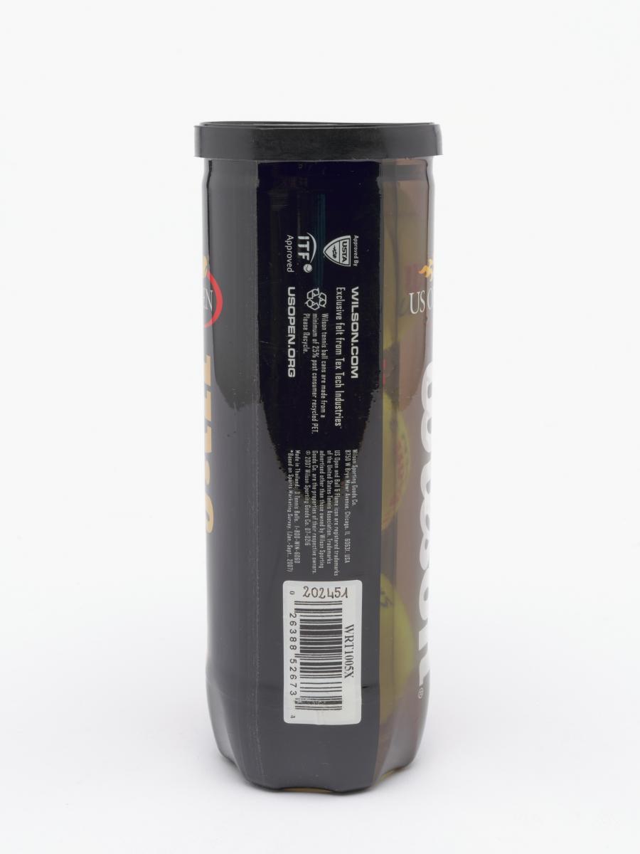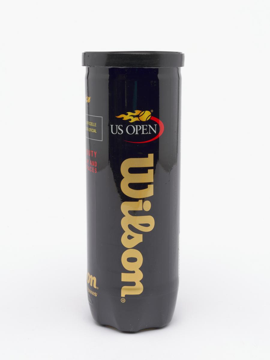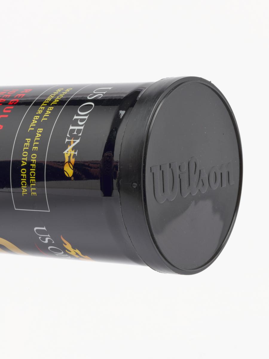 Tube fermé. Trois balles jaunes marquées d'un côté "Wilson, US OPEN 3" et de l'autre "Singapore 2010".