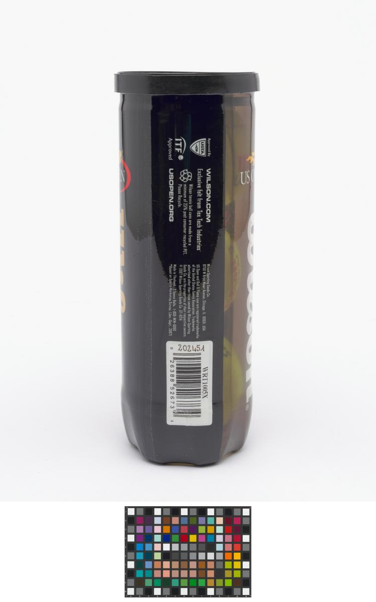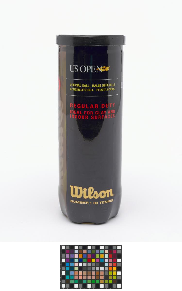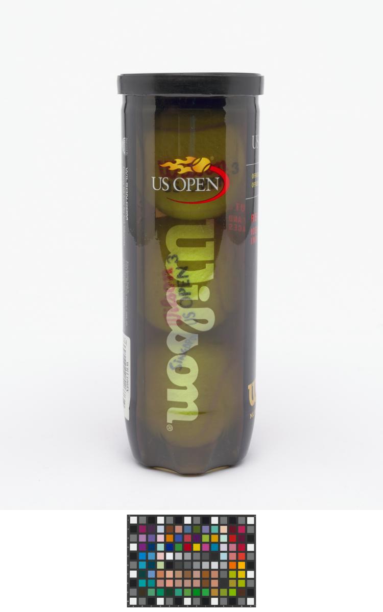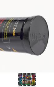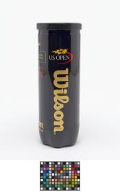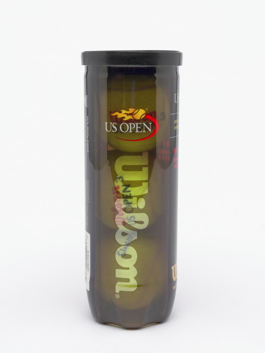 Tube fermé. Trois balles jaunes marquées d'un côté "Wilson, US OPEN 3" et de l'autre "Singapore 2010".