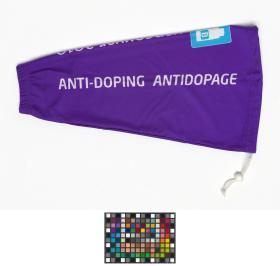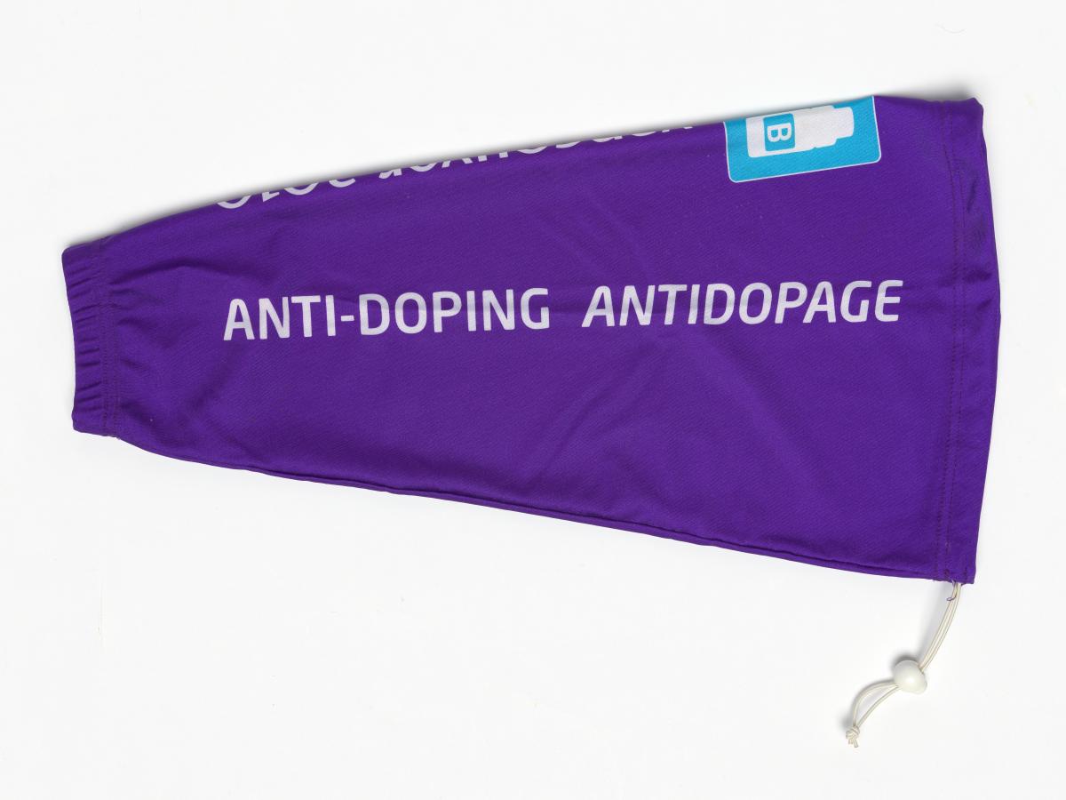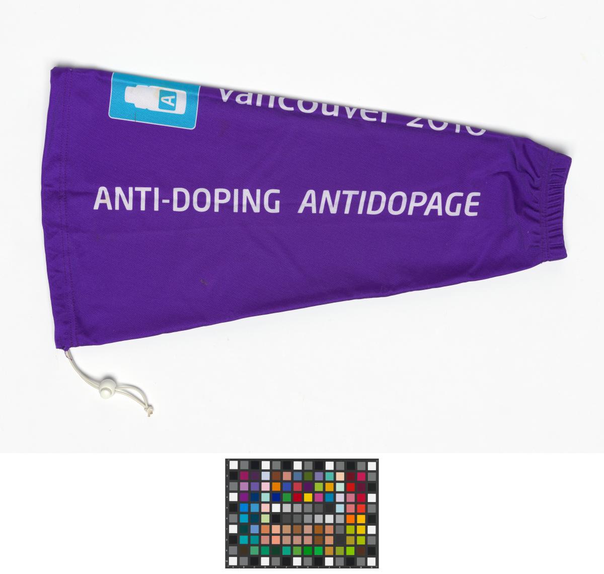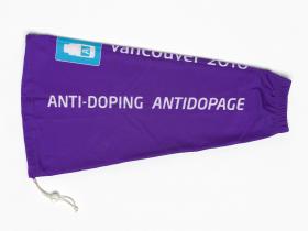 Long brassard prenant la forme d'une manche. texte: "Anti-doping Antidopage"et "Vancouver 2010", et les dessins de deux flacons de contrôle d'urine.