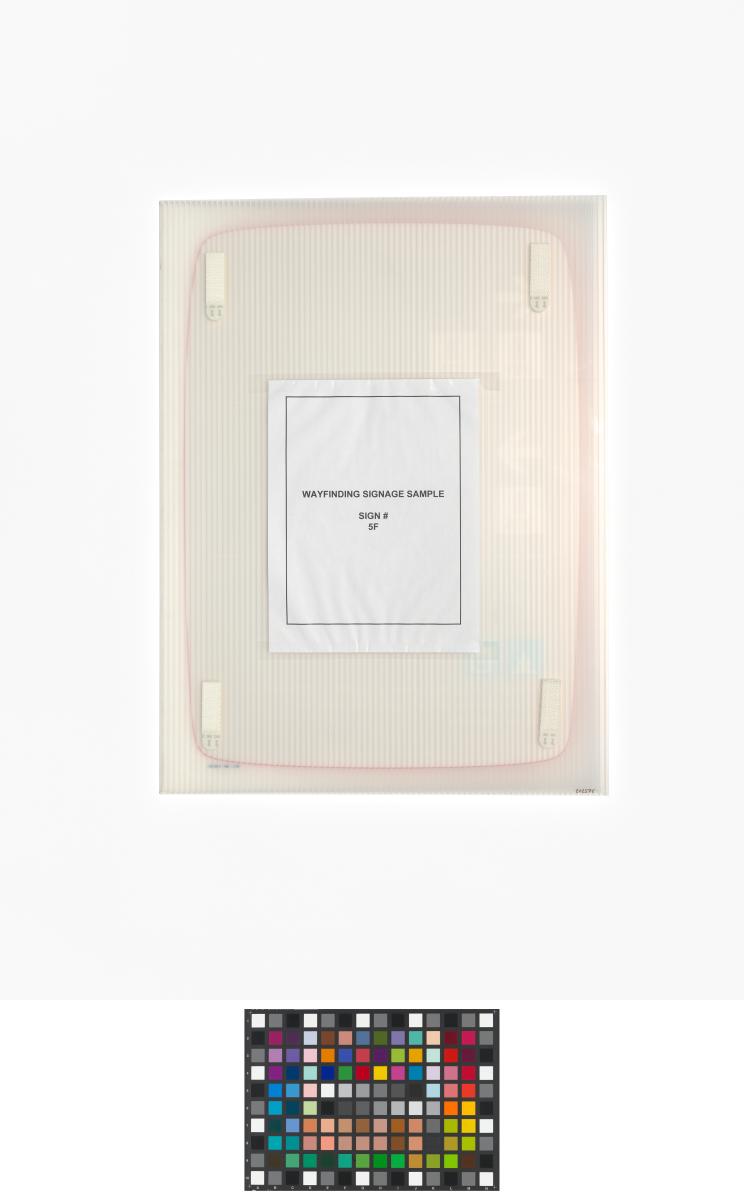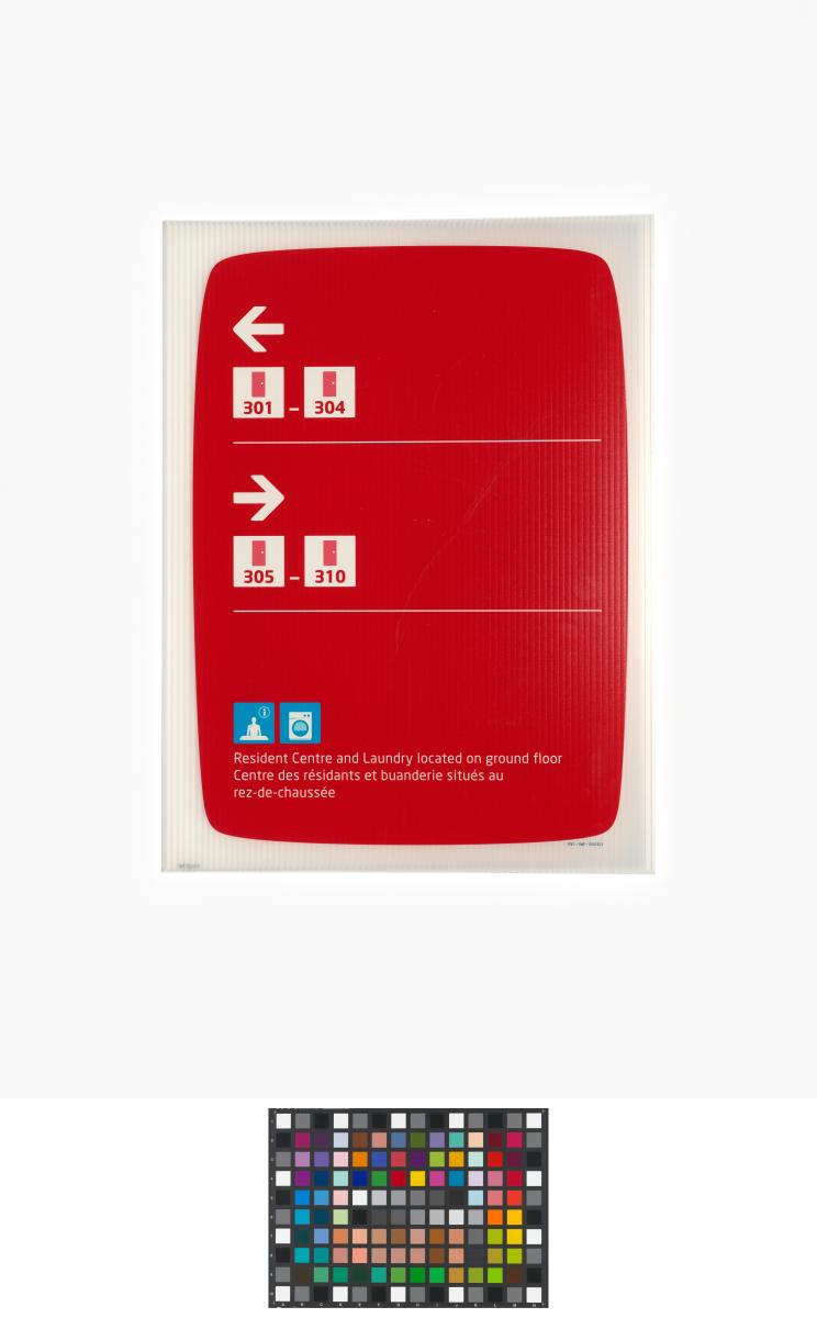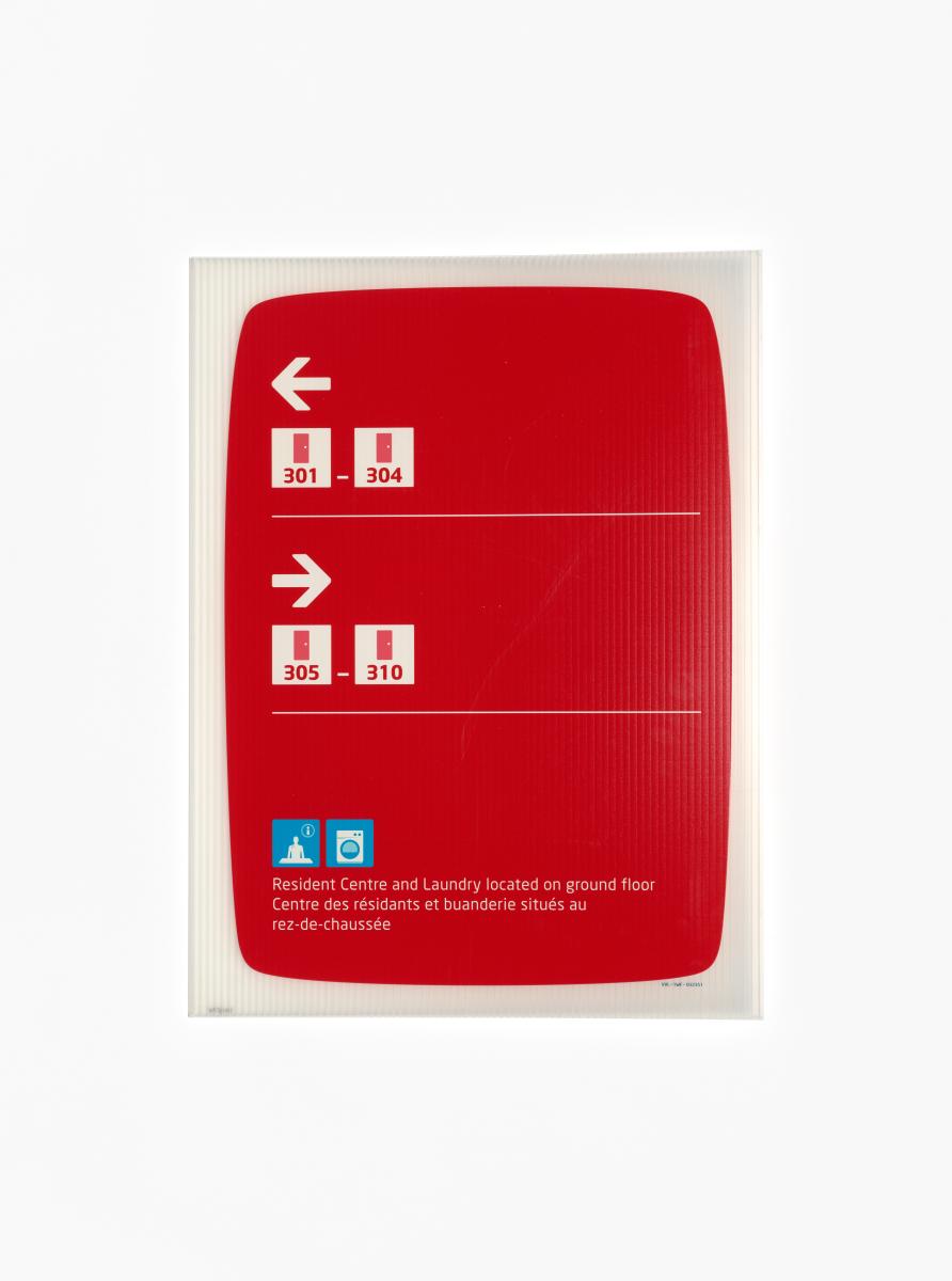 Panneau rectangulaire avec pictogrammes représentant des chambres, le centre des résidents et la buanderie. Au dos, quatre systèmes d'accroche.
