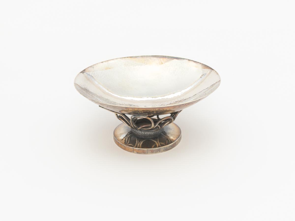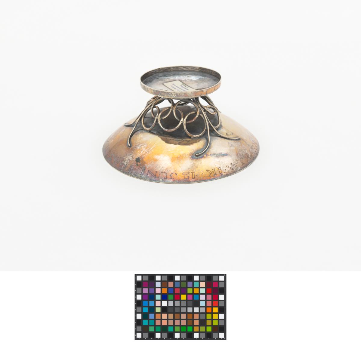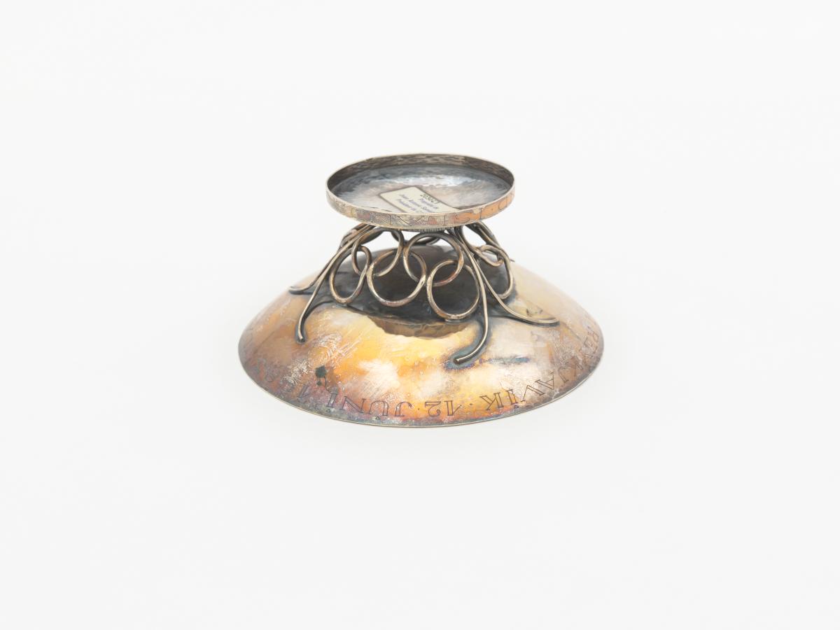 Coupelle en argent dont le pied est orné du symbole olympique. Légendes : 12 juni 1983 Juan Antonio Samaranch ; Islands fra olympunefnd”.