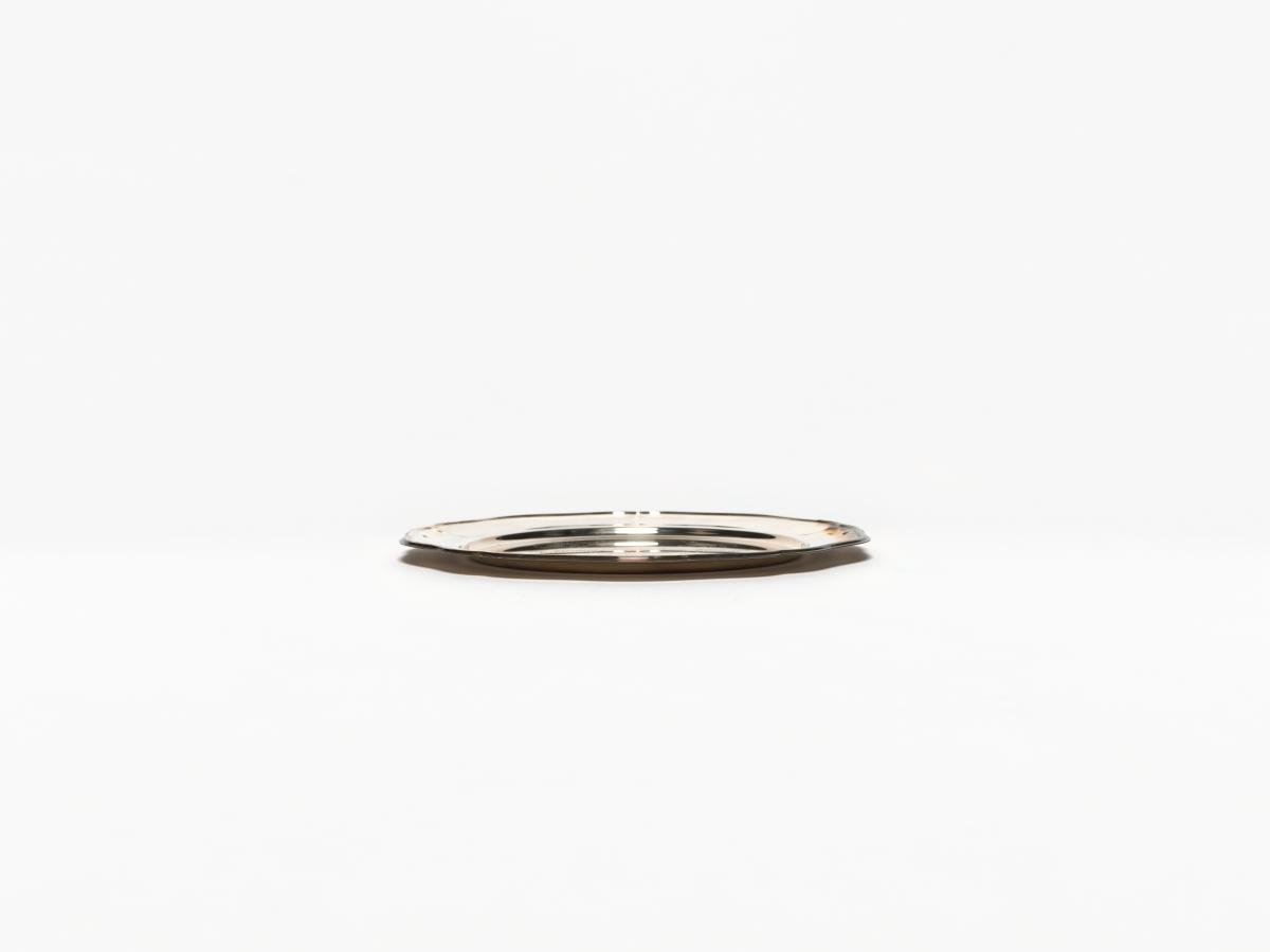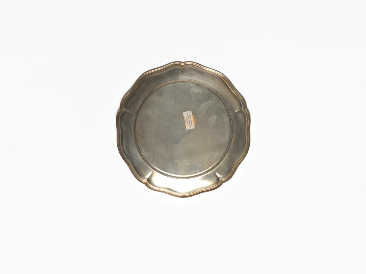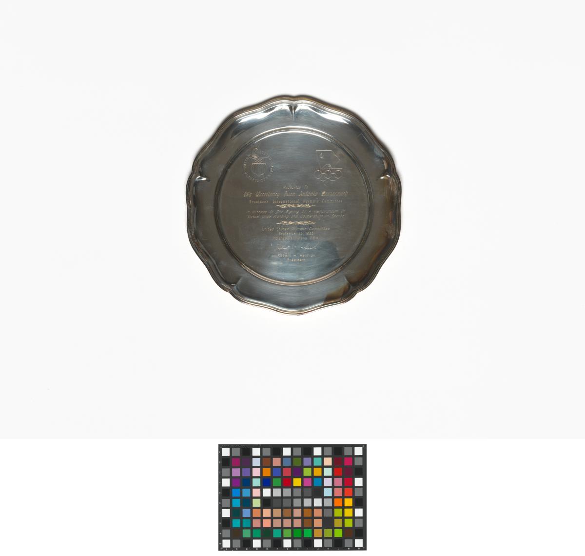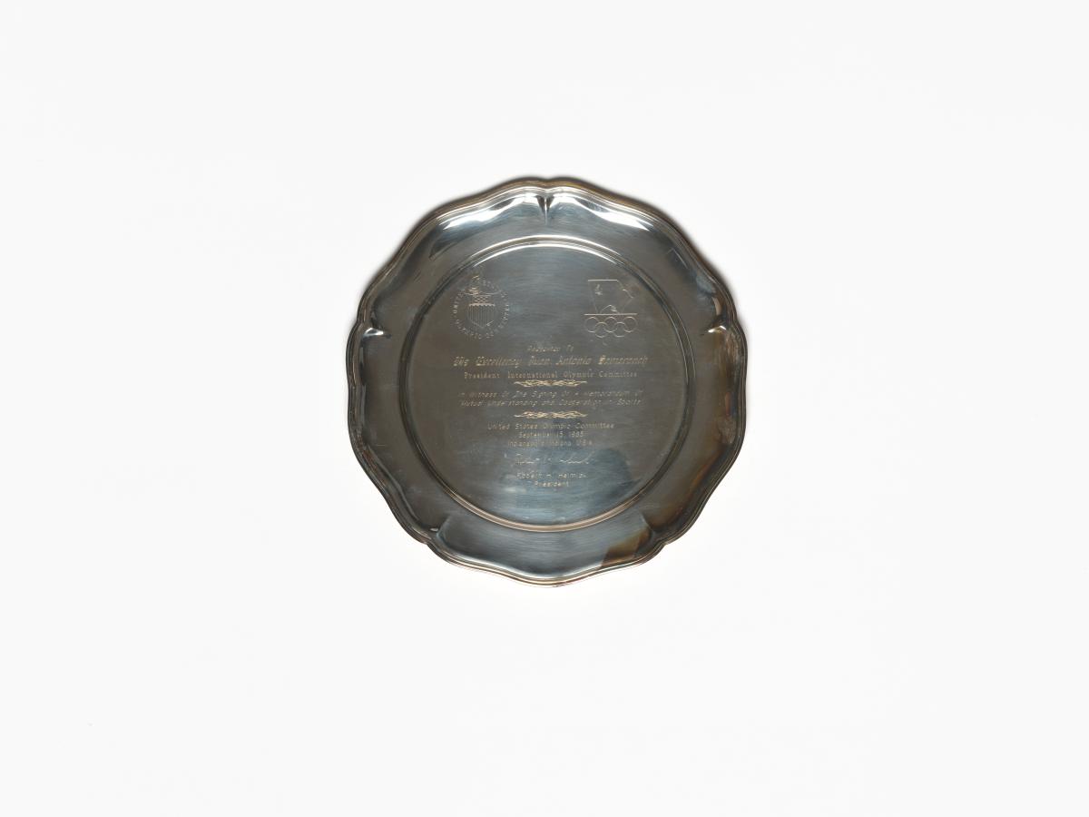 Assiette en argent. Avers : "Presented to His Excellency Juan Antonio Samaranch President Interational Olympic Committee ; In Witness of the Signing of a memorandum of « Mutual Understanding and Cooperation in sports » ; United States Olympic Committee September 15 1985 Indianapolis Indiana USA ; Robert H. Helmich President” Avec emblème des CNOs Américains et Soviétiques.
