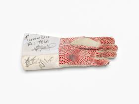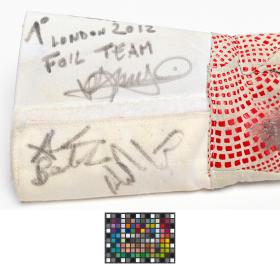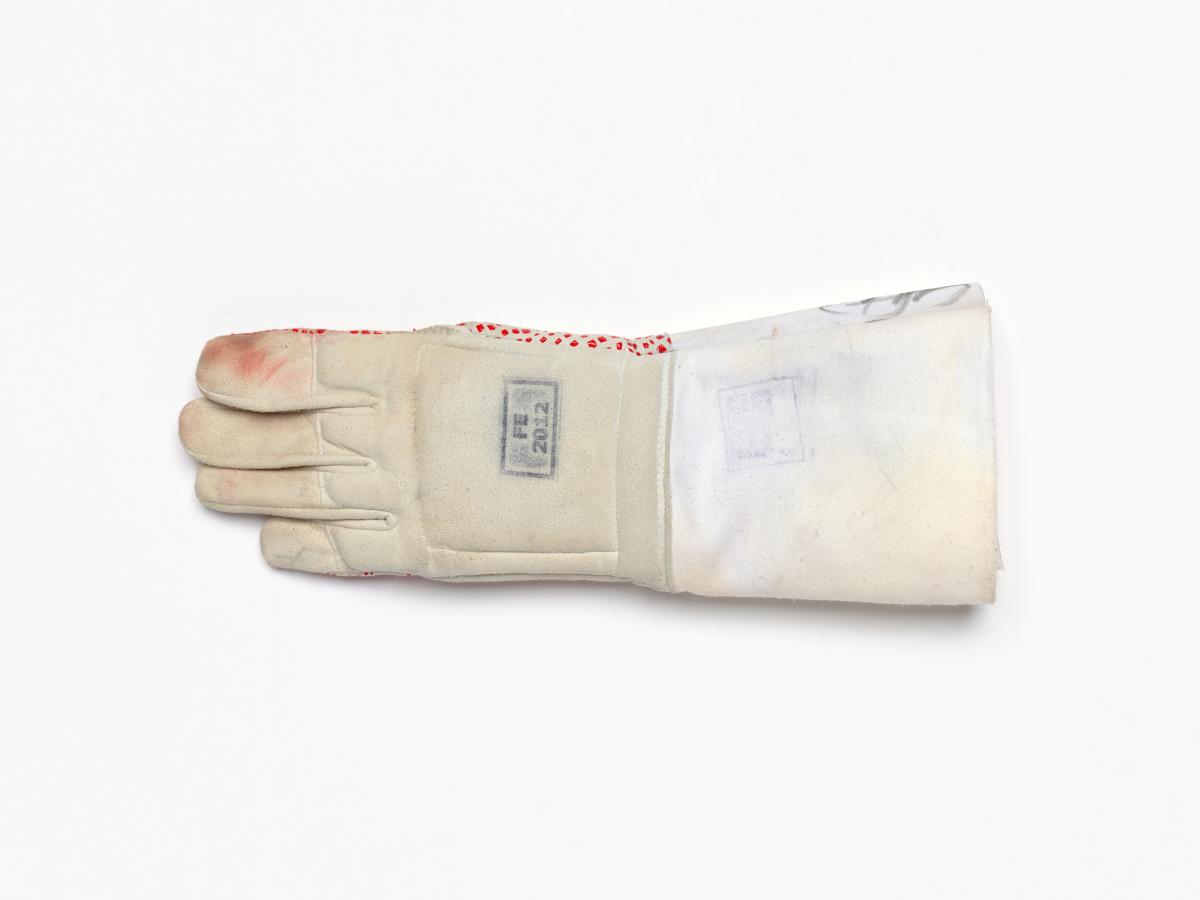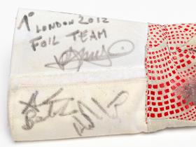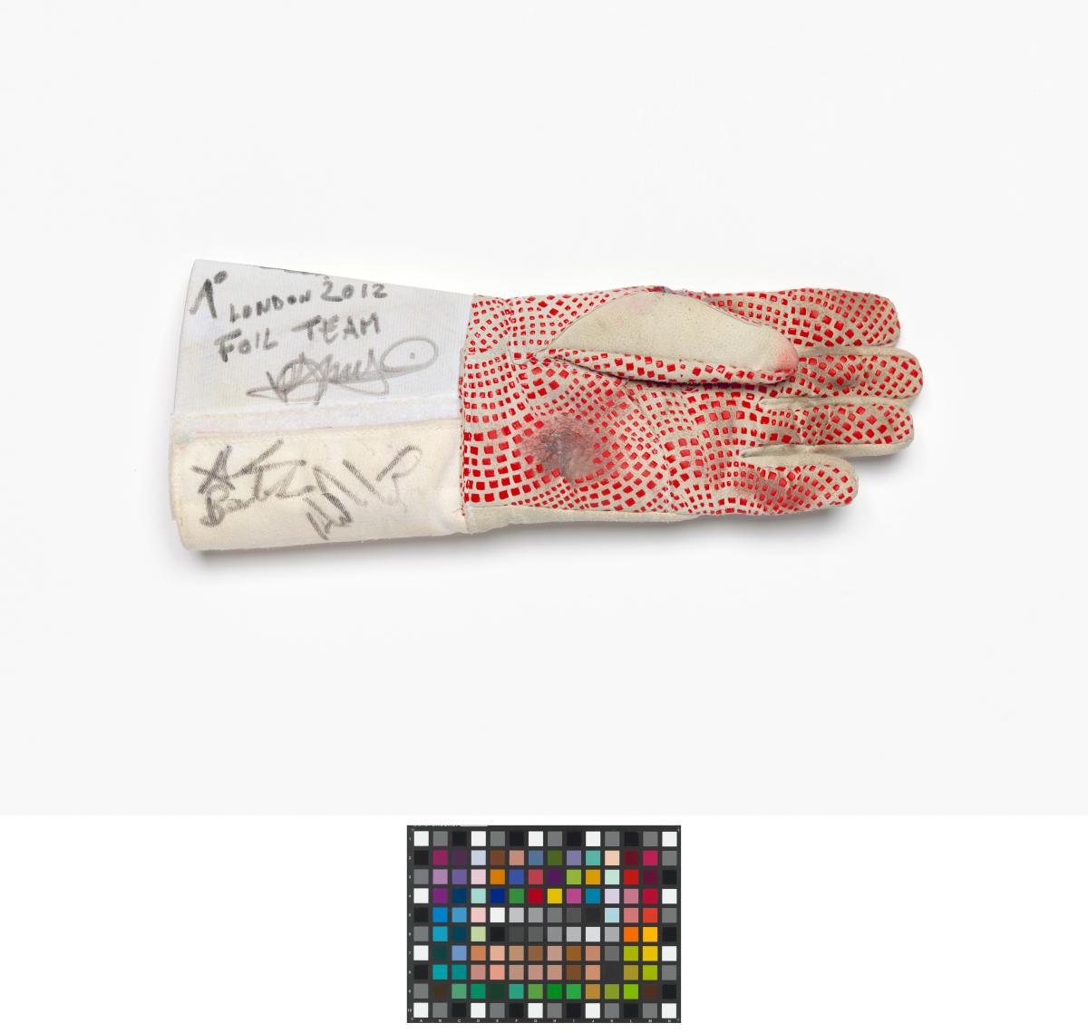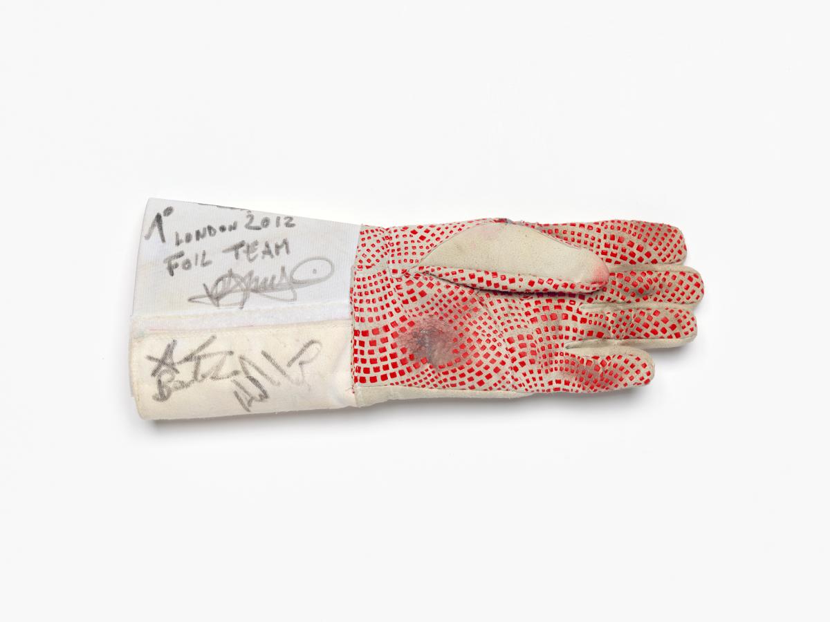 Londres 2012, gant porté par Andrea BALDINI (ITA) et signé par Valerio ASPROMONTE, Giorgio AVOLA, Andrea BALDINI et Andrea CASSARA (ITA), champions olympiques en fleuret par équipe, escrime.