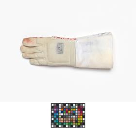 Gant d'escrime avec picots antidérapants rouges. Tampon de la Fédération d'escrime 2012 et signature de l'athlète. Taille 8 1/2.