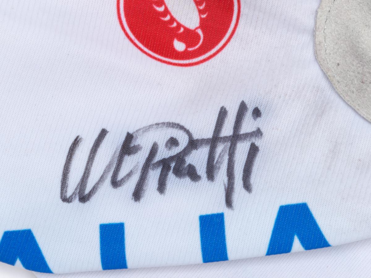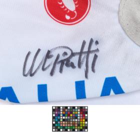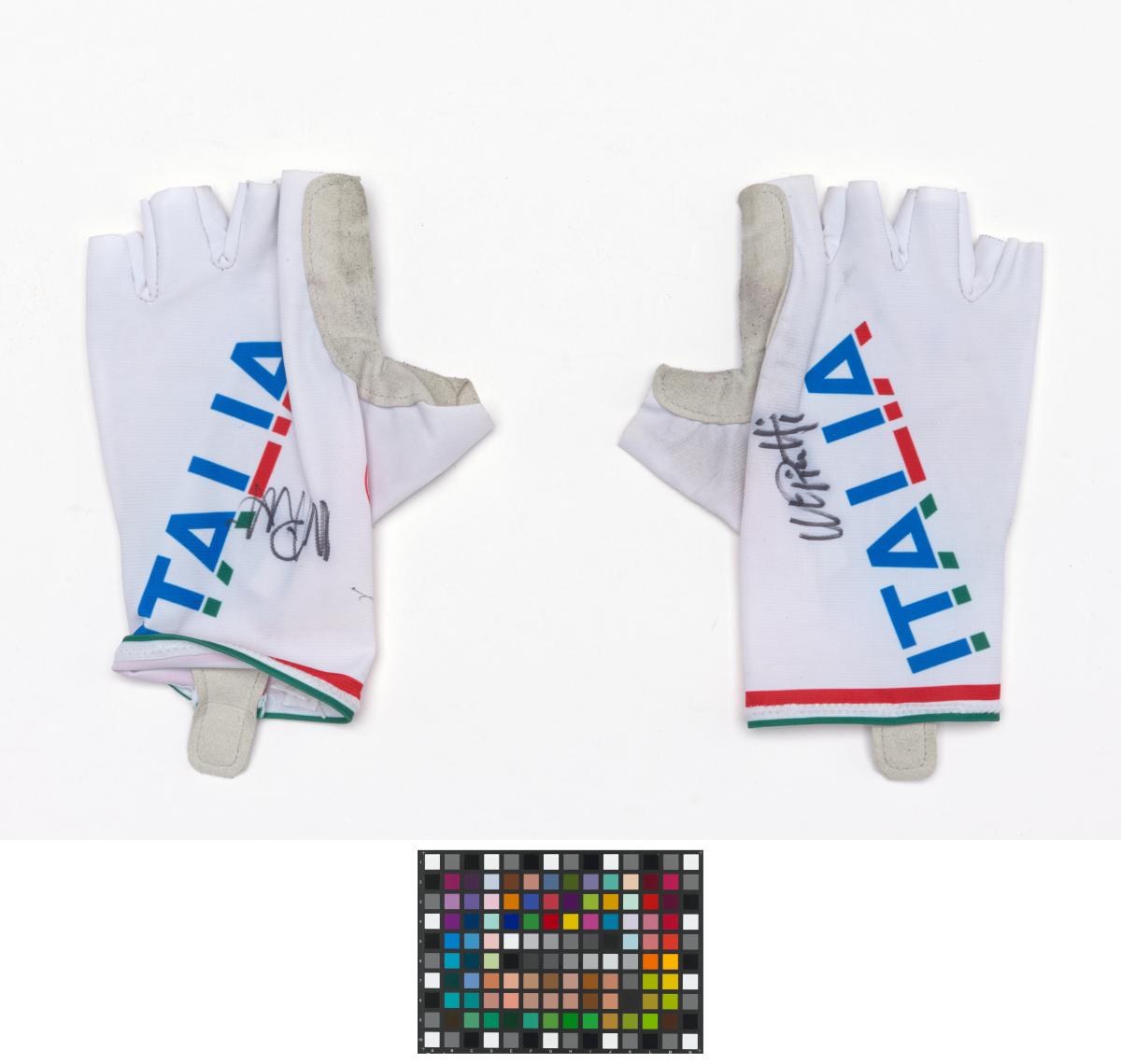 Paire de mitaines blanches. Taille L. Mention "Italia" sur le dos de la main avec traits rouge et vert aux couleurs de l'Italie. Les deux gants sont signés par l'athlète.