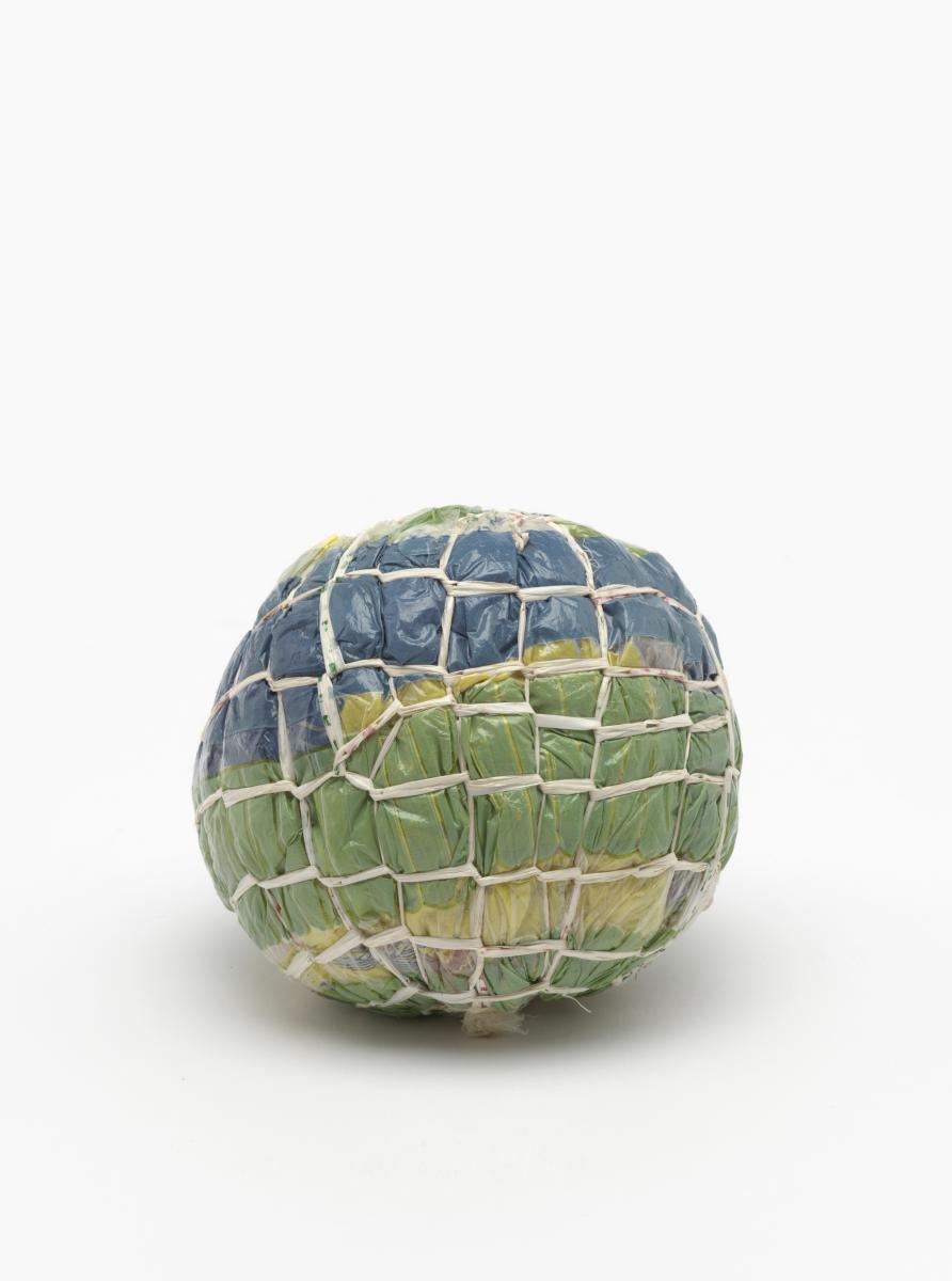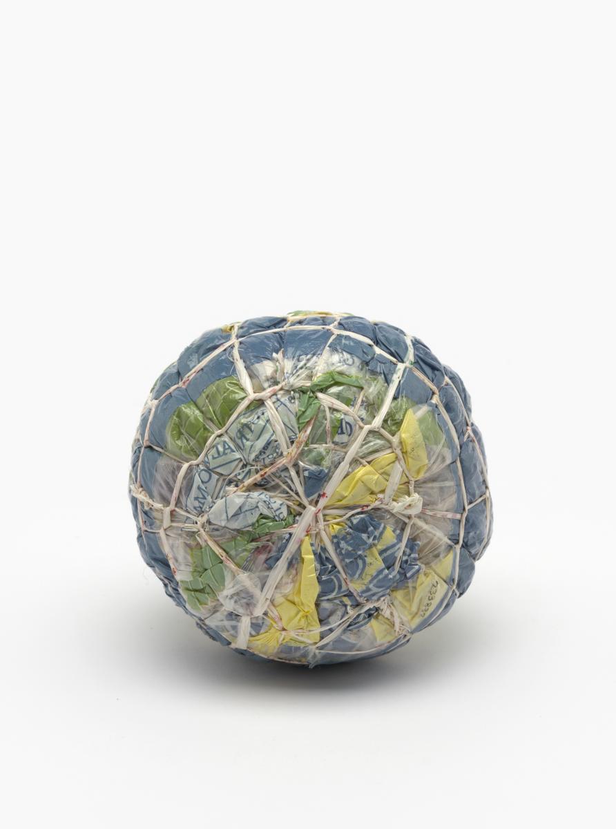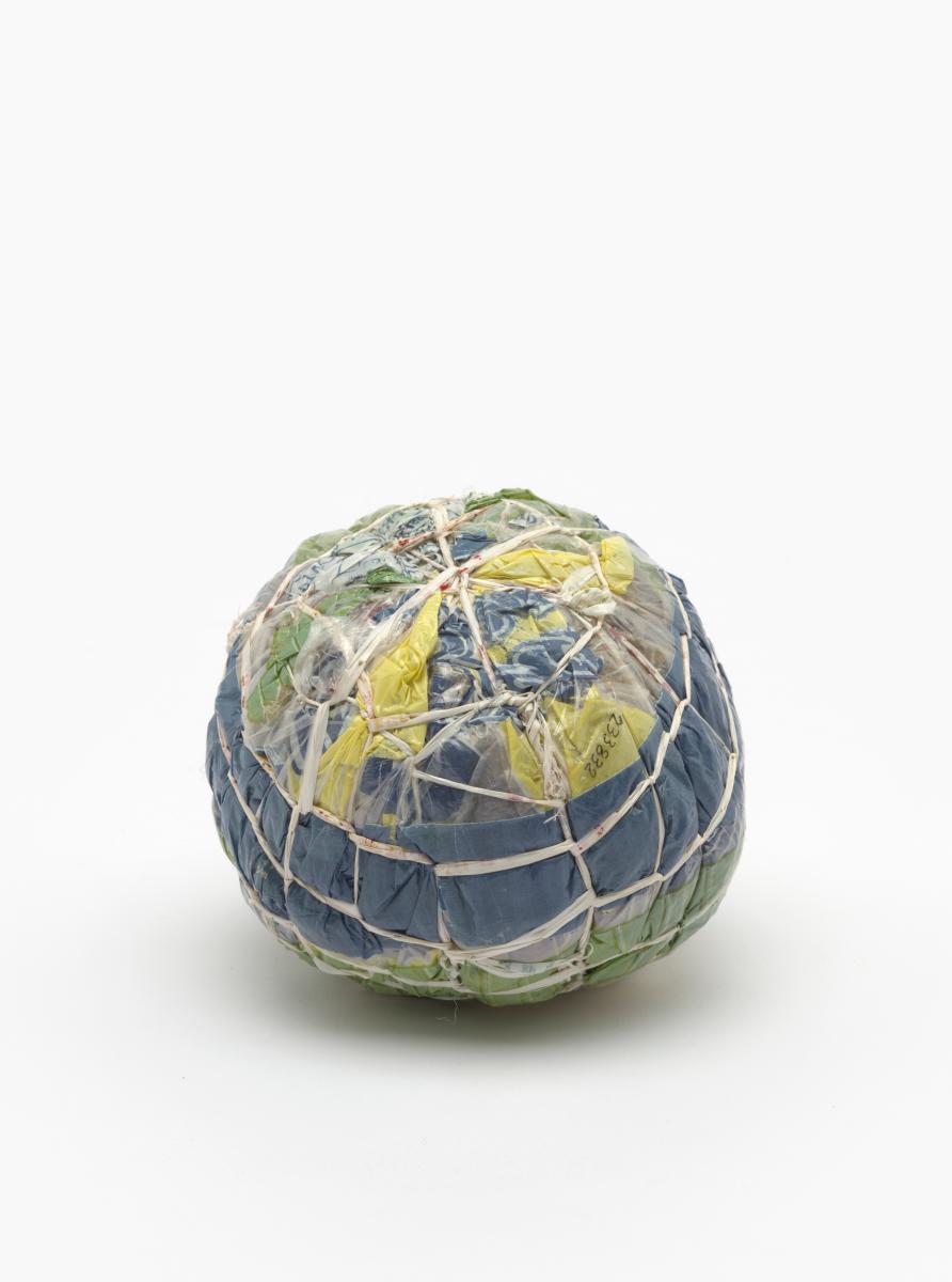 Ballon fait de sacs en plastique compressés par des ficelles.
