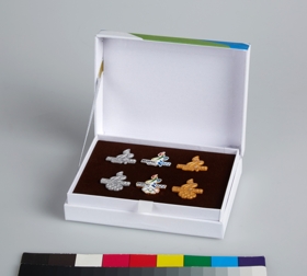 Set de 6 insignes avec l'emblème de la candidature, 2 argentés, 2 polychromes et 2 dorés, dans un coffret aux couleurs de la candidature.