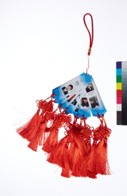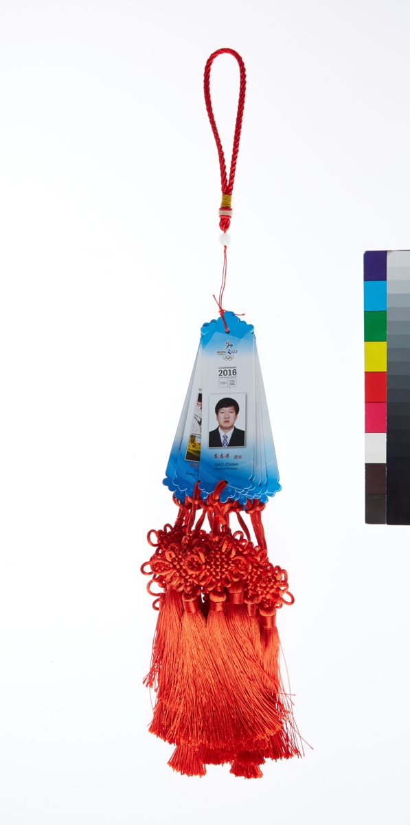 Document de présentation des membres de l'équipe de Chine comprenant 18 cartes terminées par un noeud porte-bonheur. Emblème des Jeux de Lillehammer 2016, de la candidature de Beijing 2022 et des Jeux Nationaux d'hiver de Xinjiang 2016.