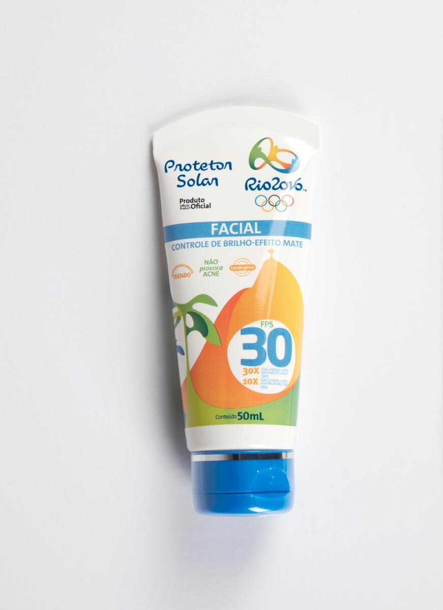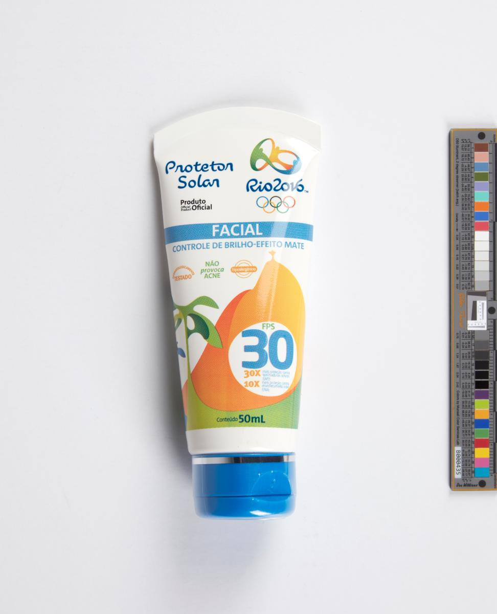 Rio 2016, tube de crème solaire avec l'identité visuelle.