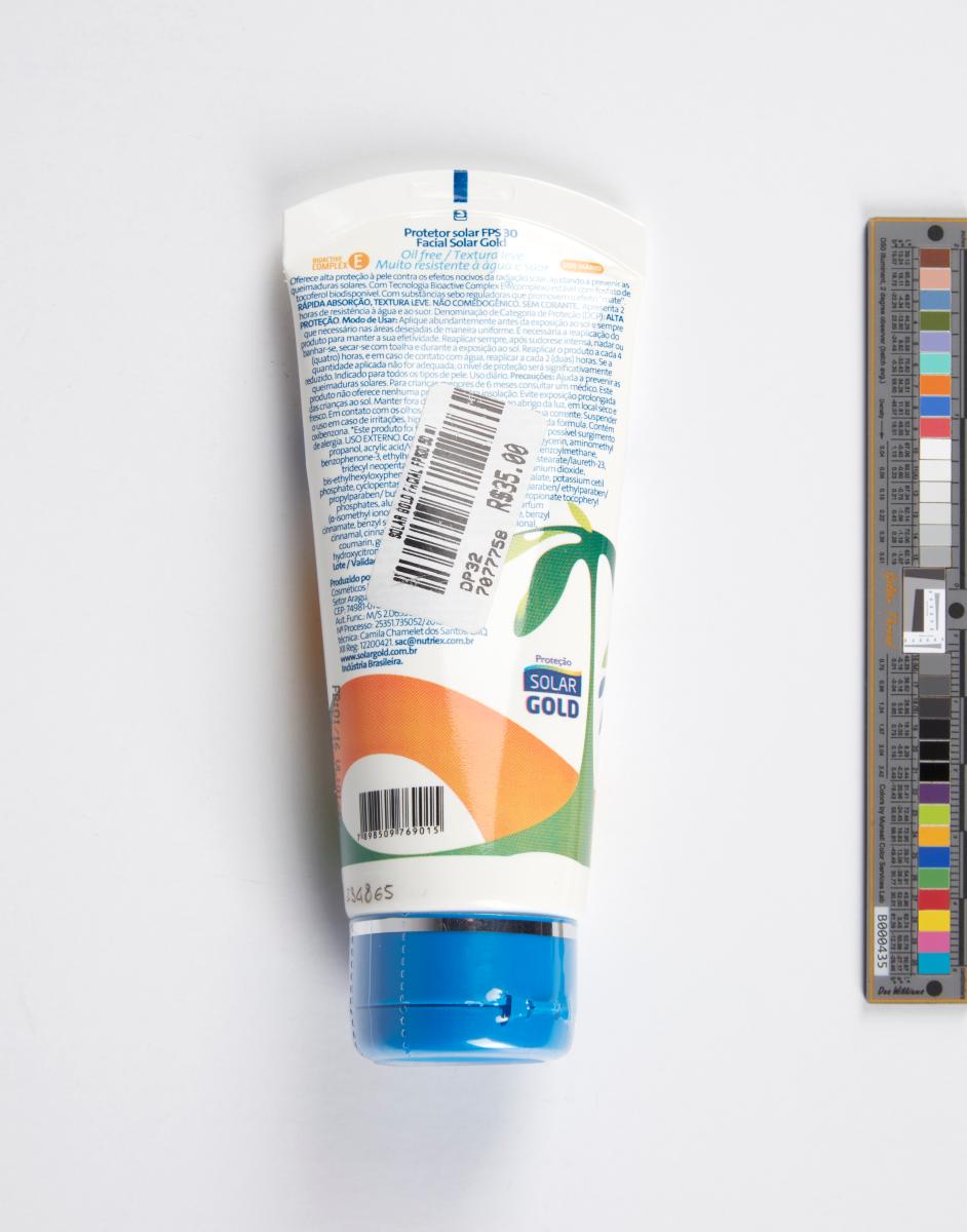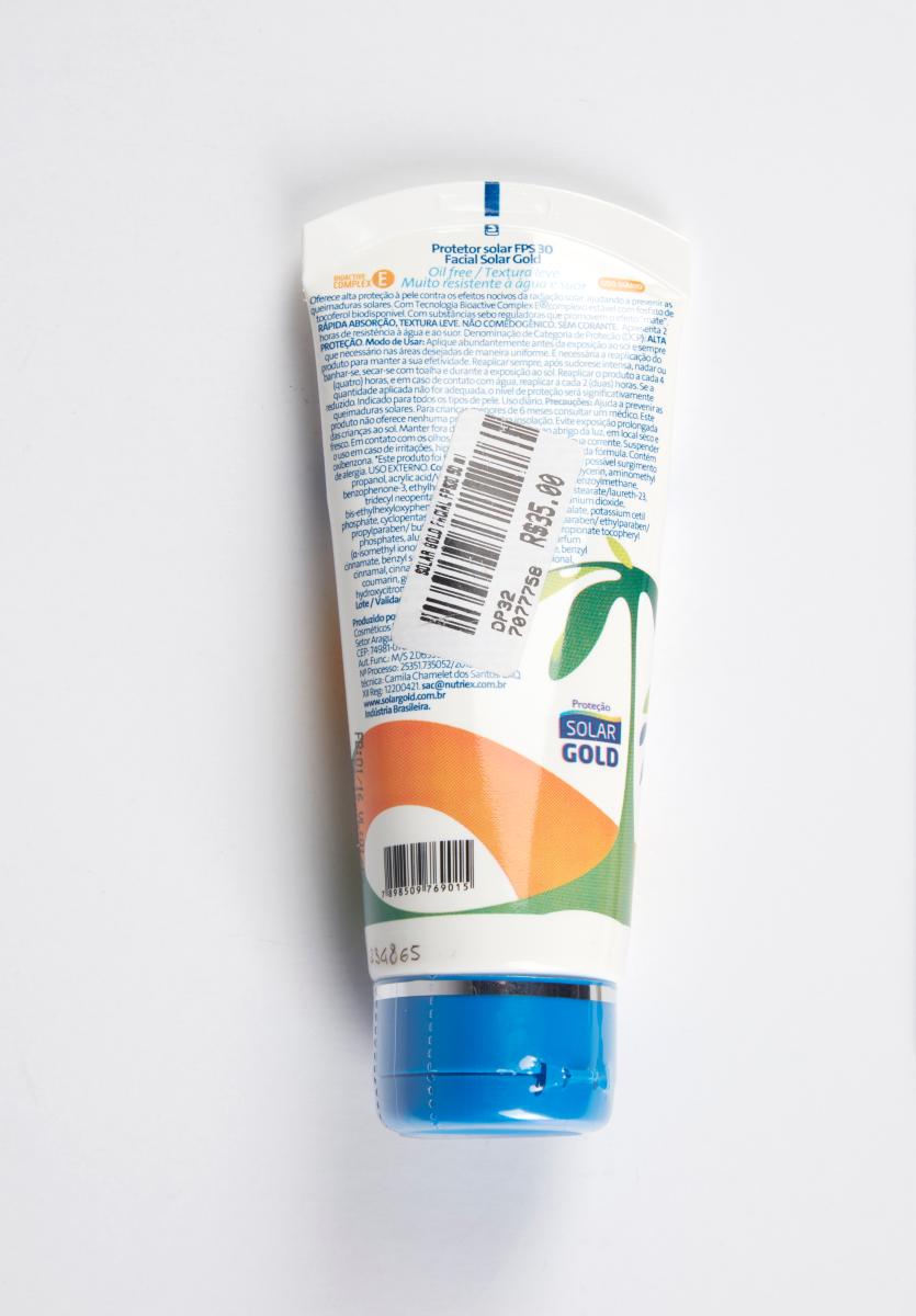 Tube de crème solaire, indice 30, avec la ligne graphique et l'emblème des Jeux. Produit licencié.