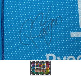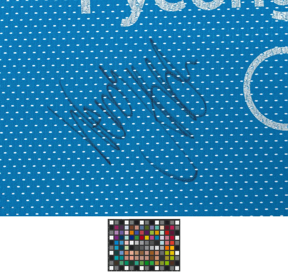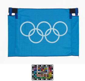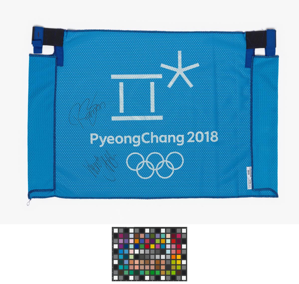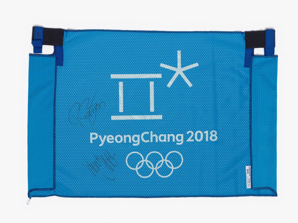 PyeongChang 2018, banderole de porte de ski de l'épreuve parallèle par équipes mixtes, signée par l'équipe de Suisse (SUI), or.