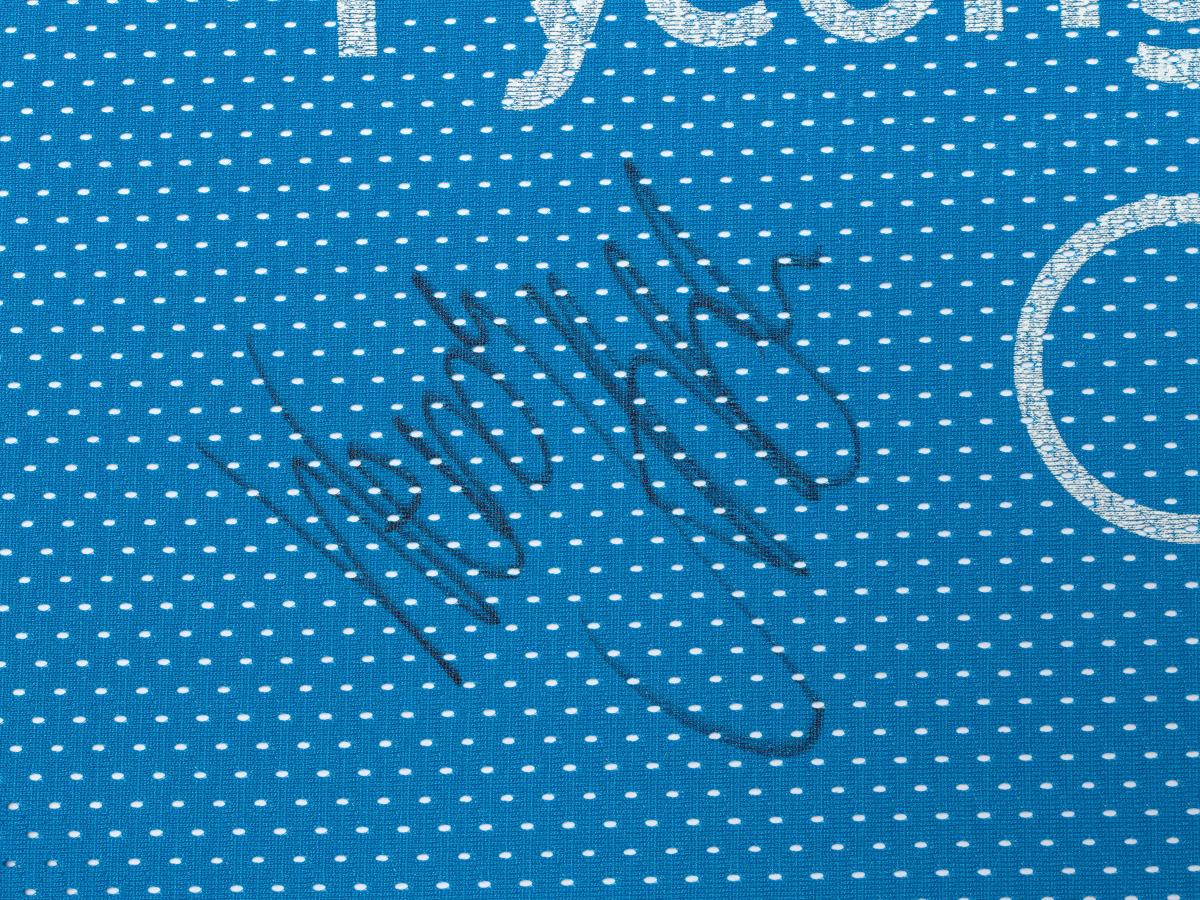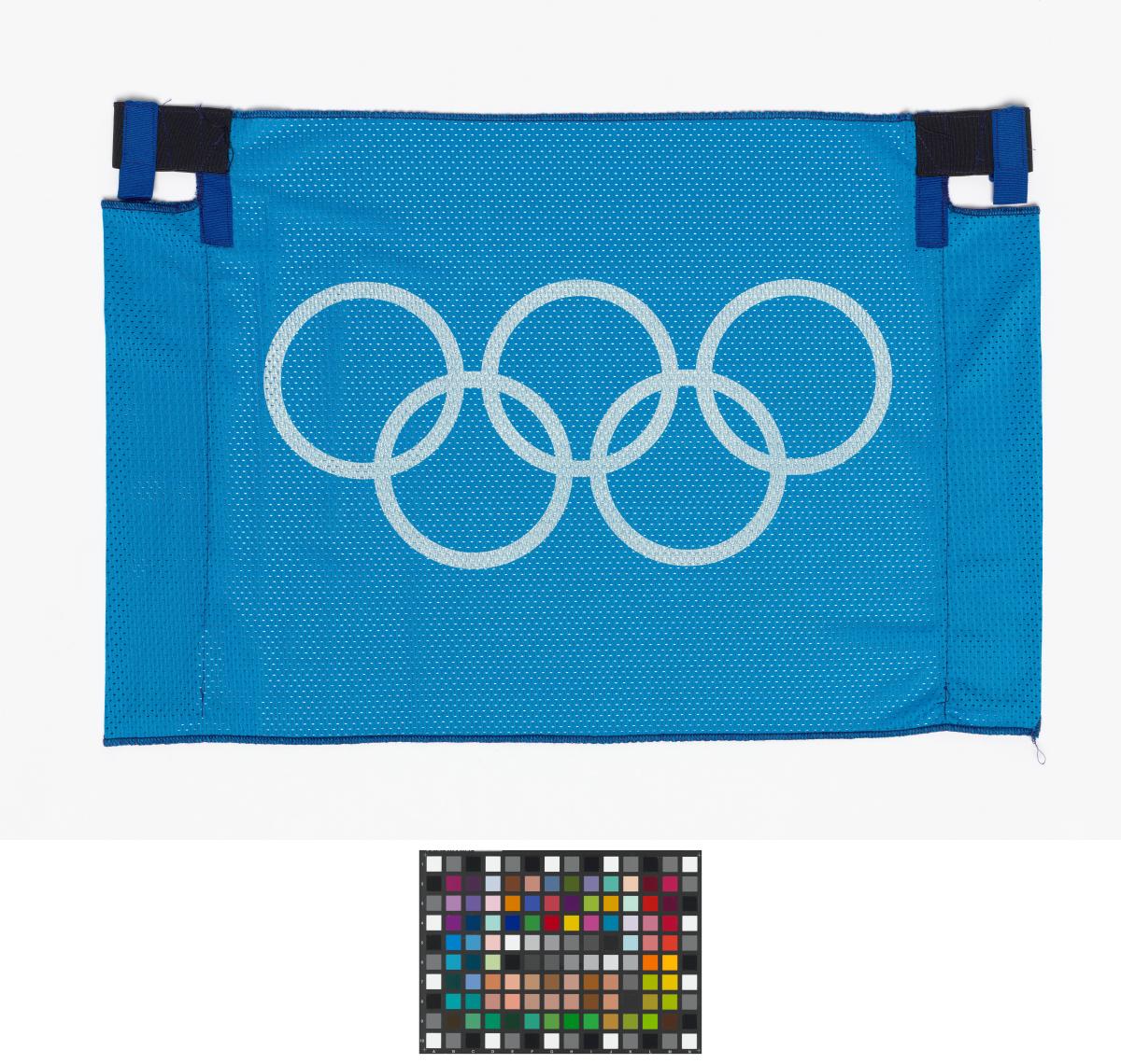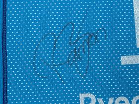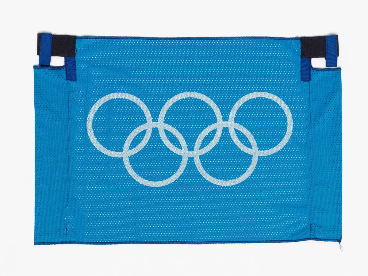 Banderole bleu de l'épreuve parallèle par équipes mixtes avec l'emblème des Jeux, signée par 2 des 6 membres de l'équipe suisse (SUI), or, et anneaux olympiques au dos. Chiffre 1 au feutre dans le passant supérieur gauche.