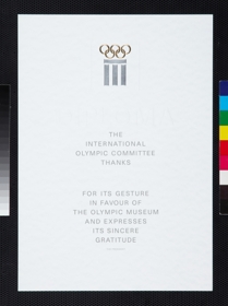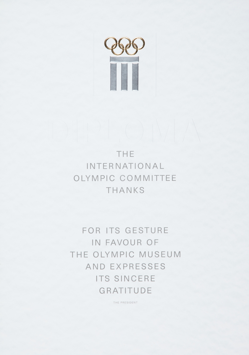 Logo du Musée Olympique et texte : "DIPLOMA / THE / INTERNATIONAL / OLYMPIC COMMITTEE / THANKS / / FOR ITS GESTURE / IN FAVOR OF / THE OLYMPIC MUSEUM / AND EXPRESSES / ITS SINCERE / GRATITUDE".