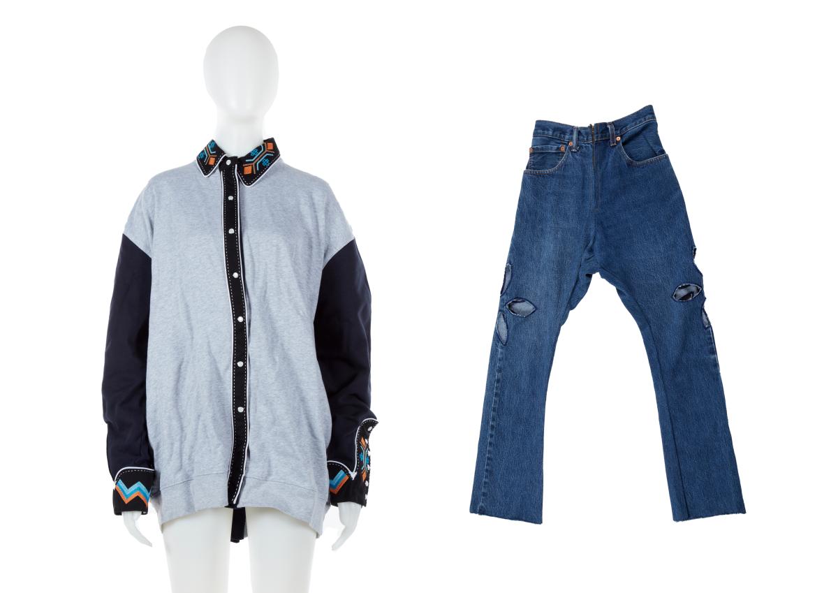 Ensemble composé d'une veste oversize et d'un jean déchiré.