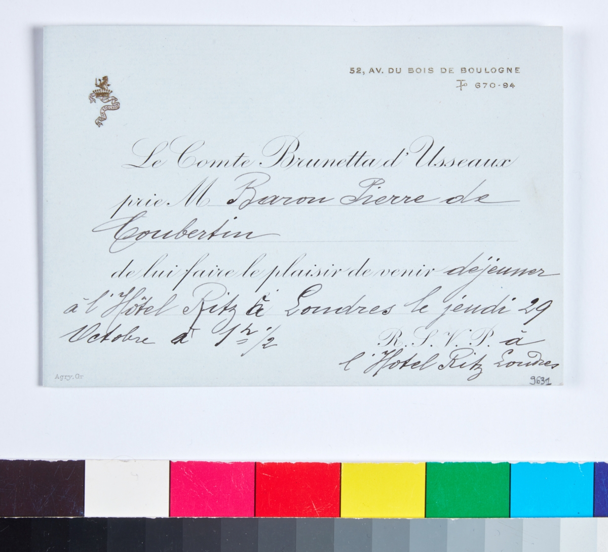 Carte envoyée par le Comte Brunetta d'Usseaux au Baron Pierre de Coubertin pour l'inviter à déjeuner le 29 octobre 1908 à l'Hôtel Ritz de Londres.