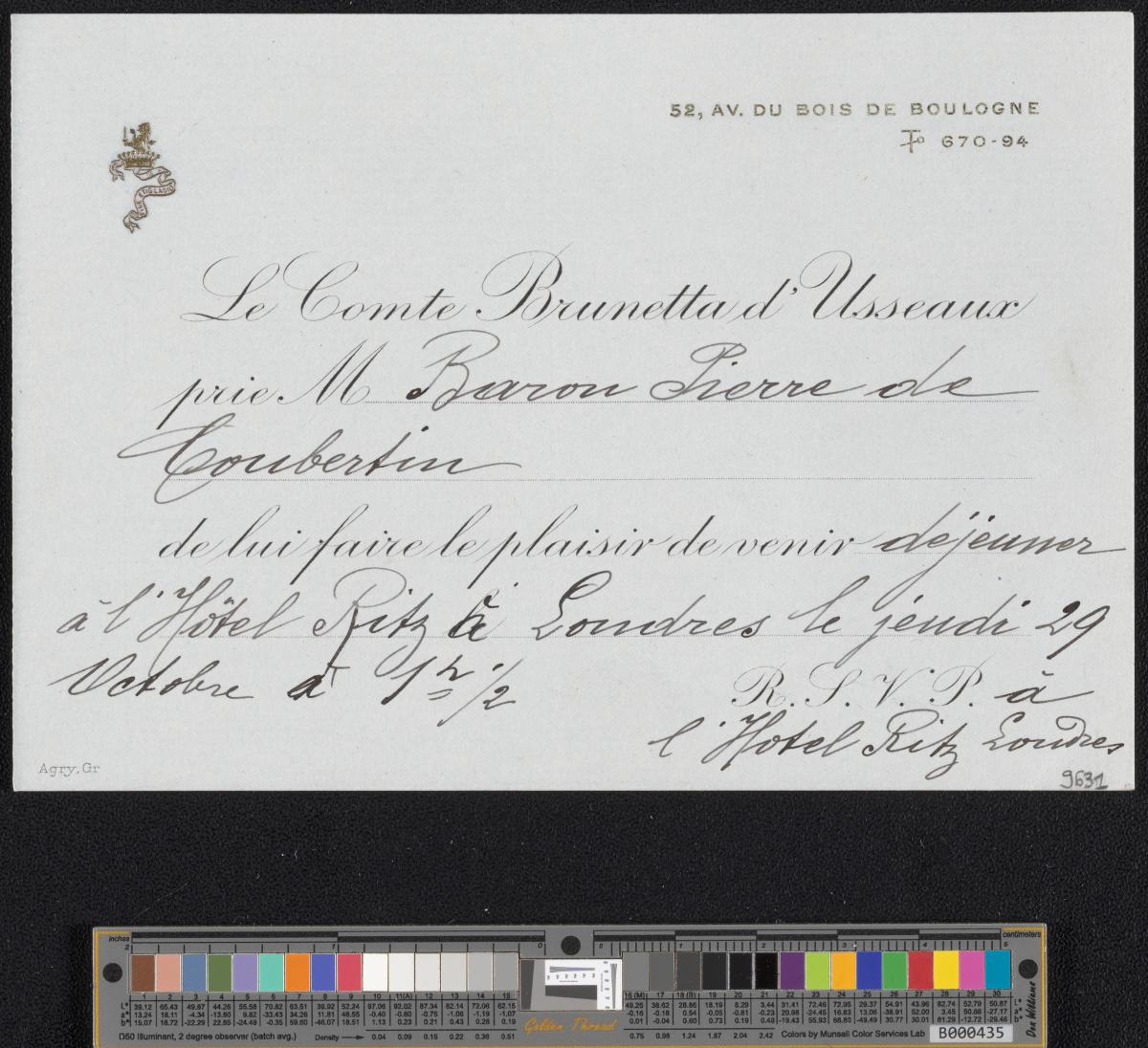 Carte envoyée par le Comte Brunetta d'Usseaux au Baron Pierre de Coubertin pour l'inviter à déjeuner le 29 octobre 1908 à l'Hôtel Ritz de Londres.