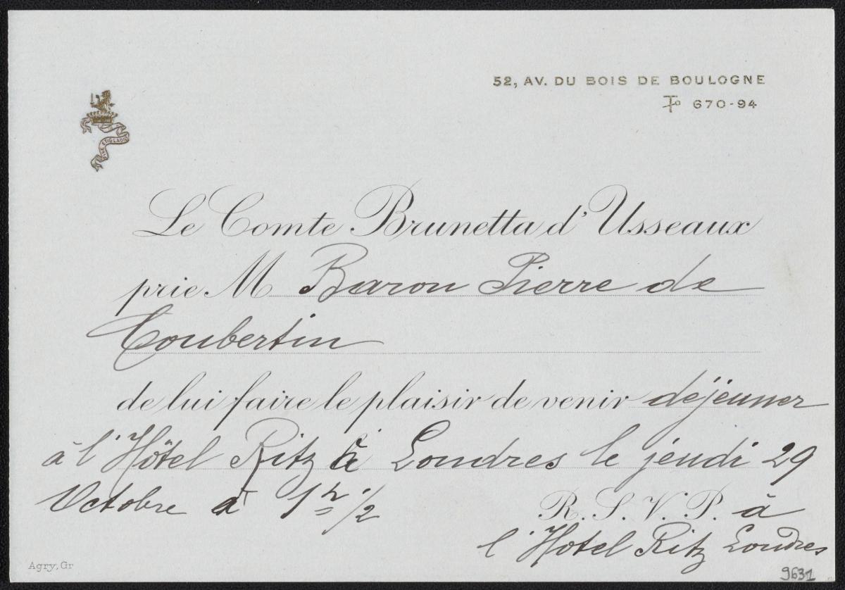 Londres 1908, carte d'invitation à un déjeuner à l'Hôtel Ritz le 29 octobre, adressée au Baron Pierre de Coubertin par le Comte Brunetta d'Usseaux.