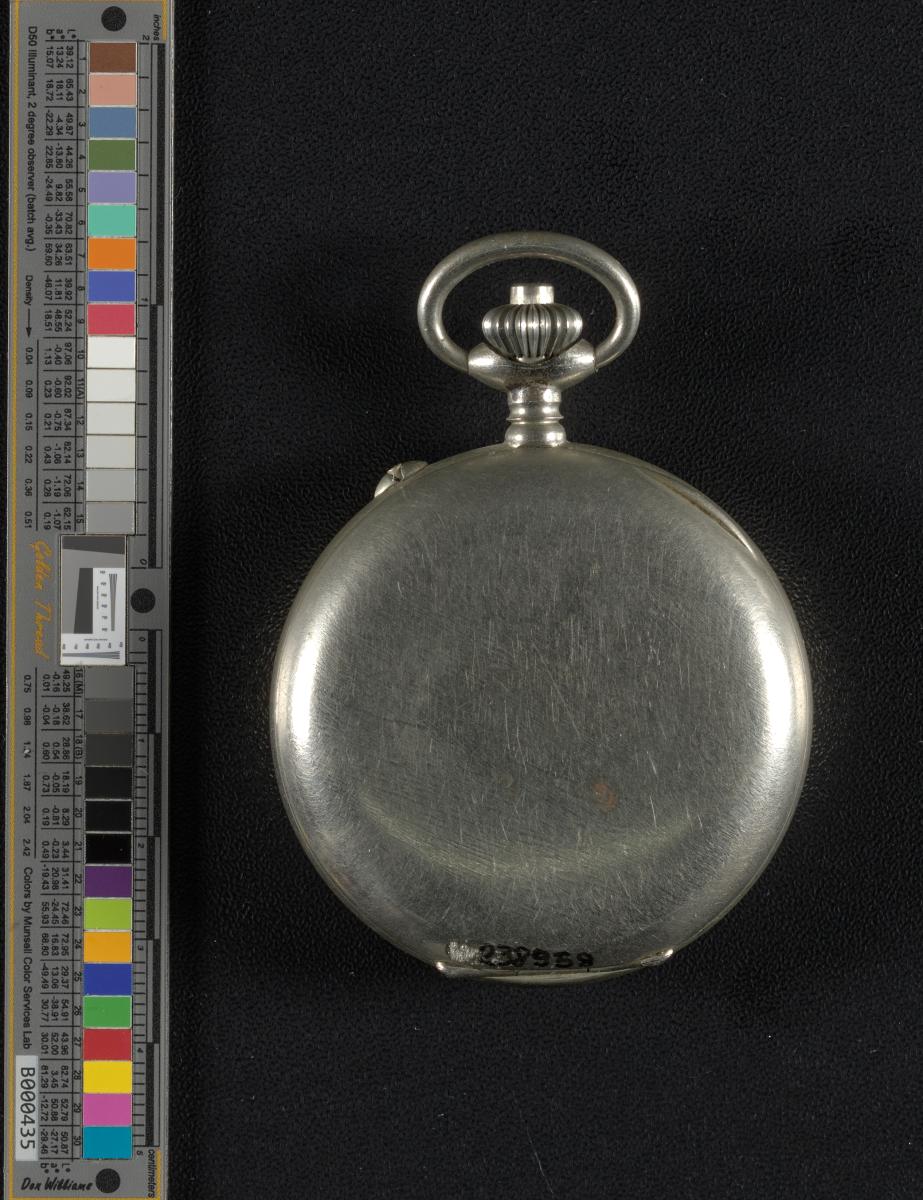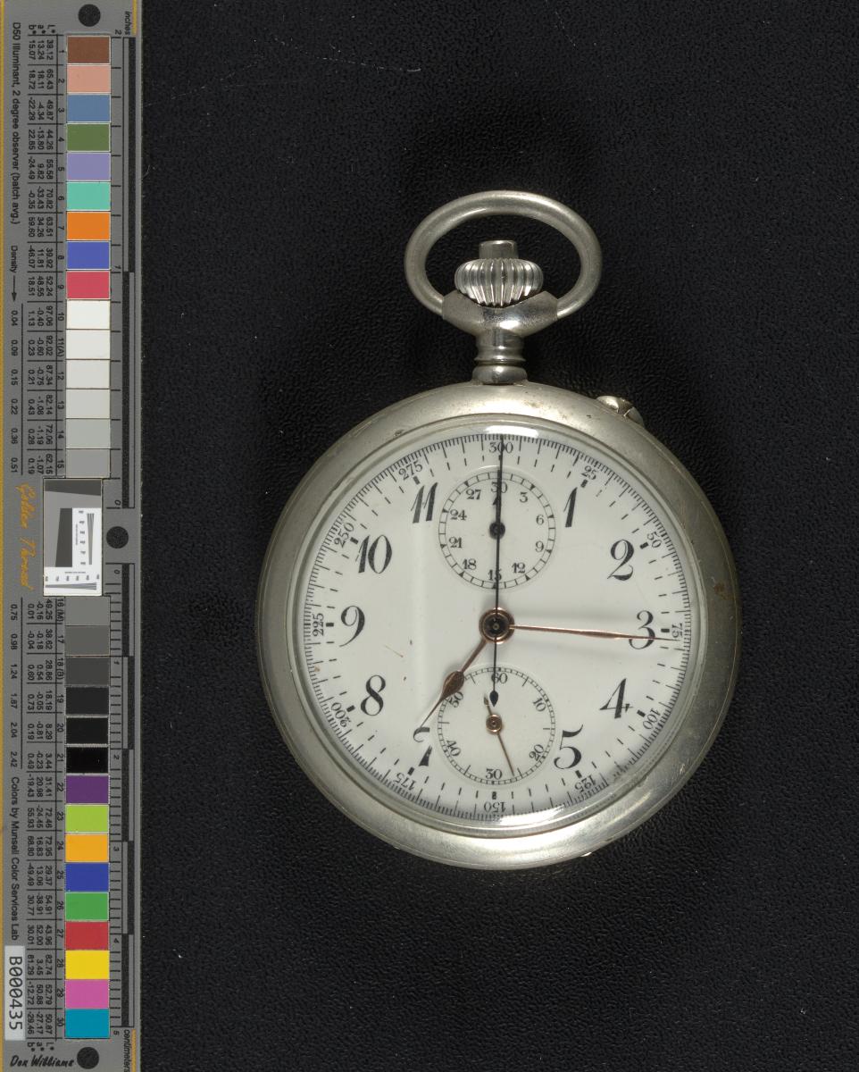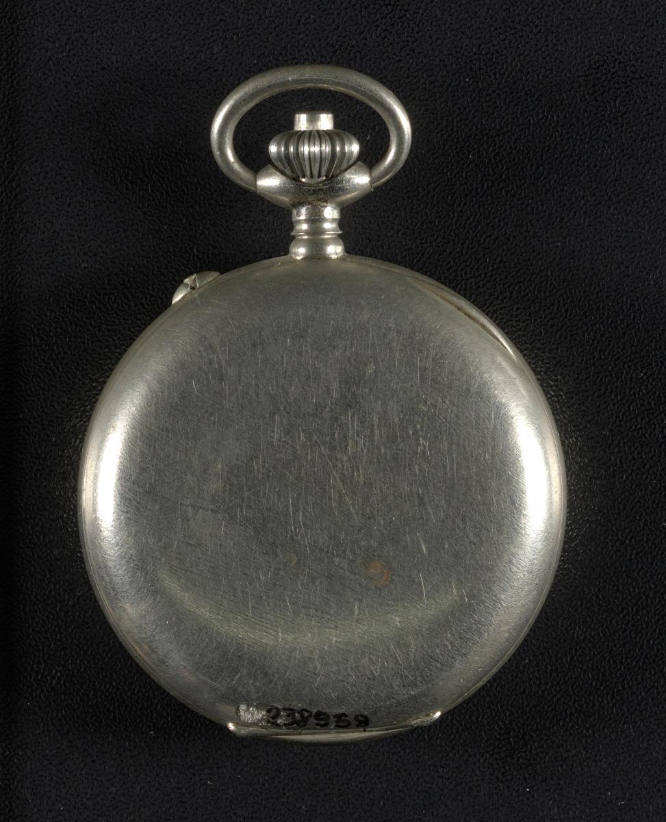 Chronographe à deux rattrapantes. Double fond et double poussoir. Mouvement à remontage manuel. Le chronographe s'ouvre manuellement à l'arrière. Là, plusieurs chiffres sont inscrits, peut-être des numéros de série.