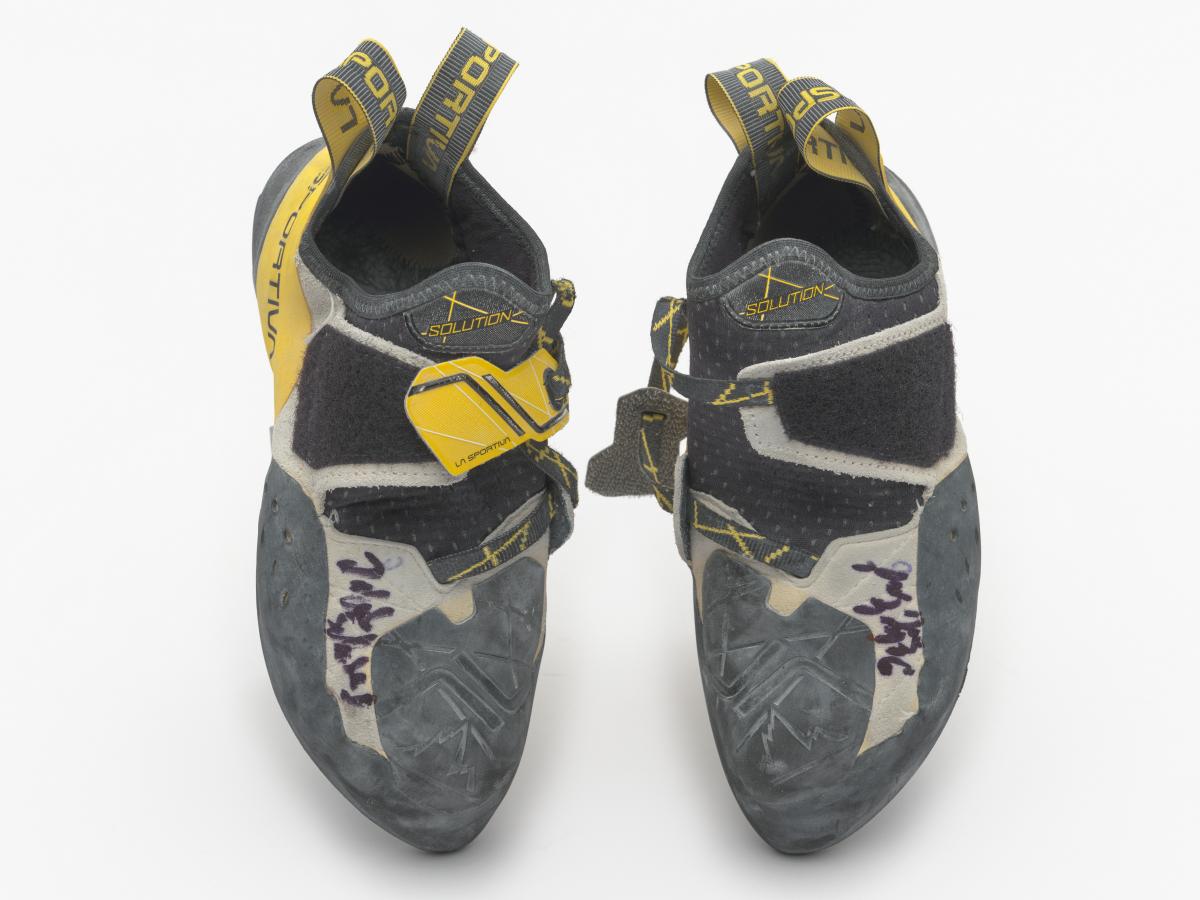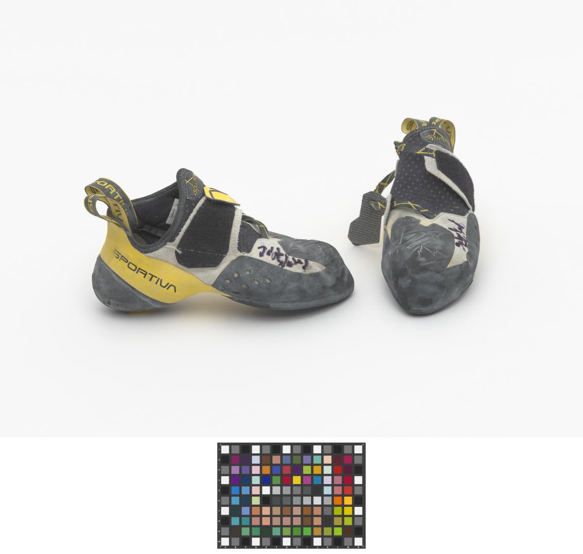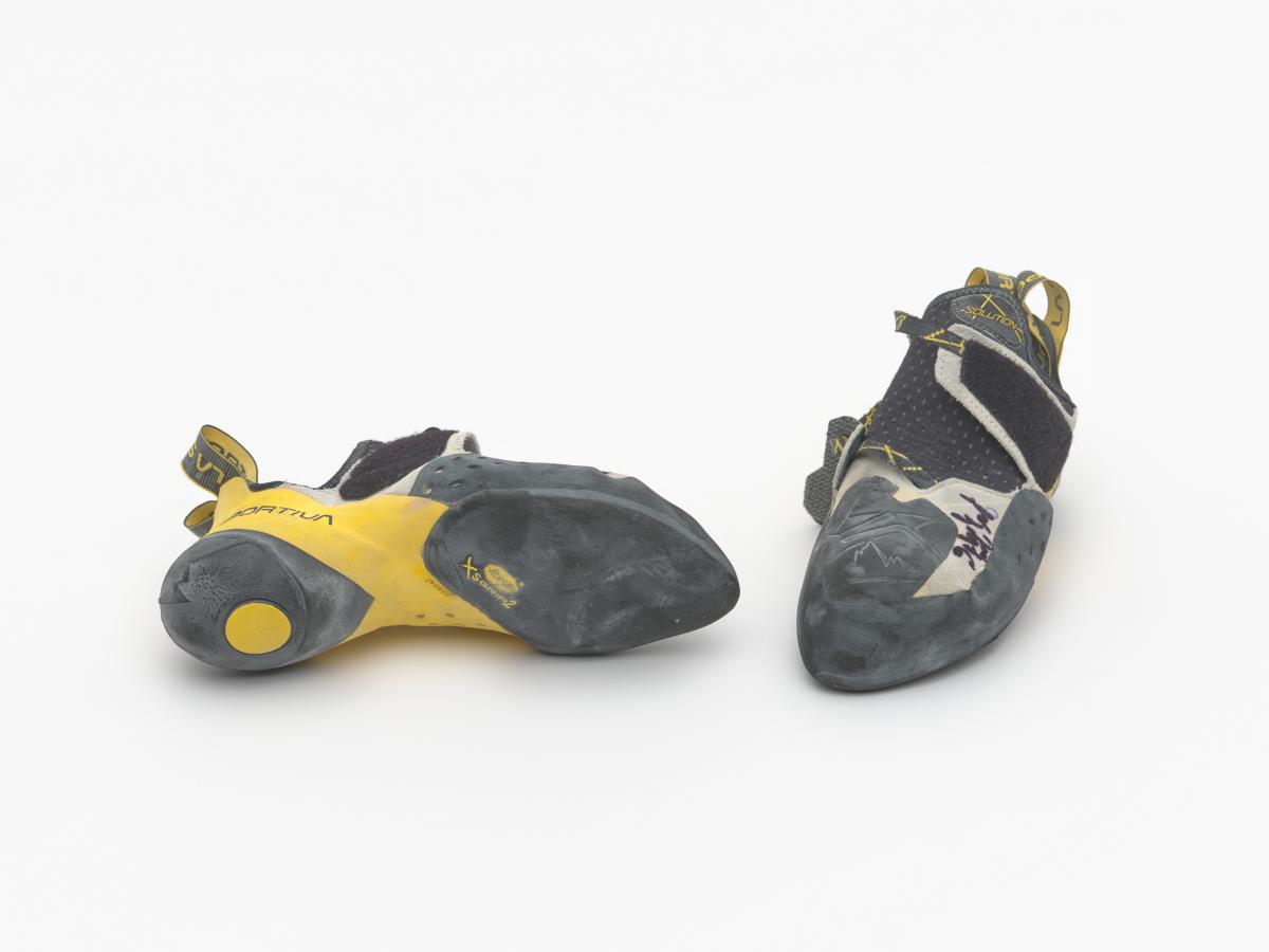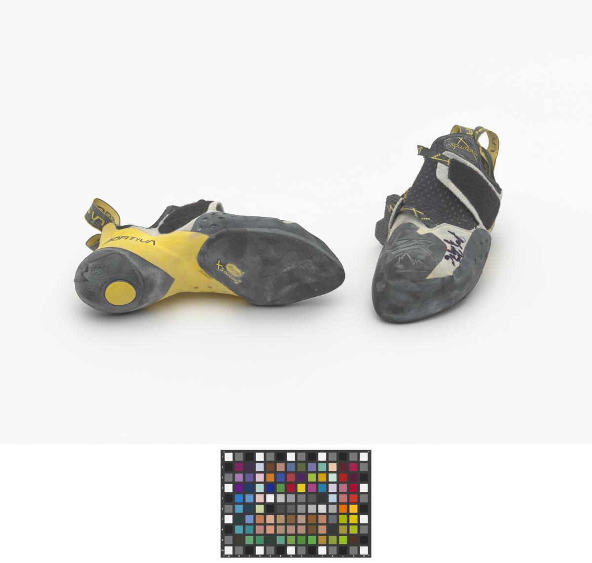 Paire de chaussures d'escalade, de marque La Sportiva, modèle Solution. Taille 39. Signature de l'athlète.
