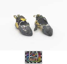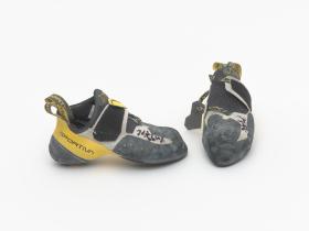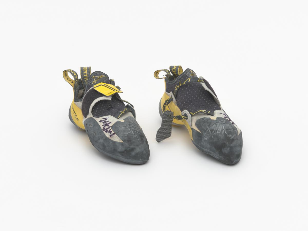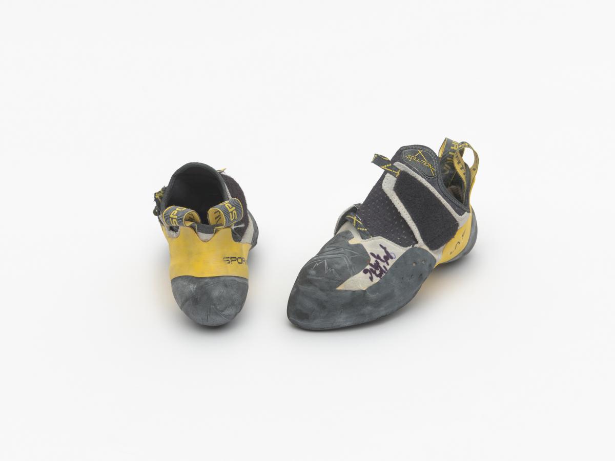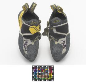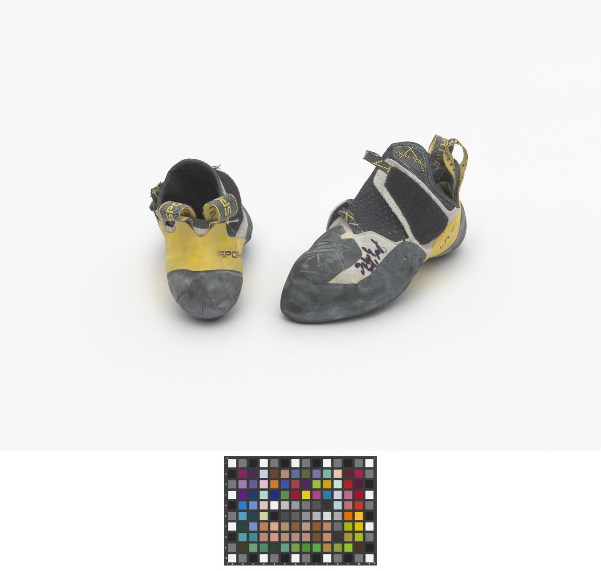 Paire de chaussures d'escalade, de marque La Sportiva, modèle Solution. Taille 39. Signature de l'athlète.