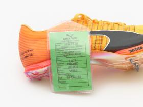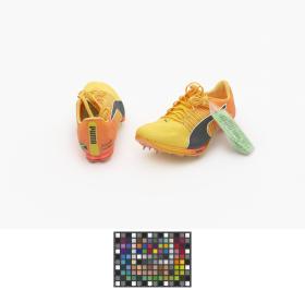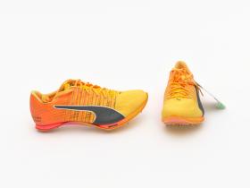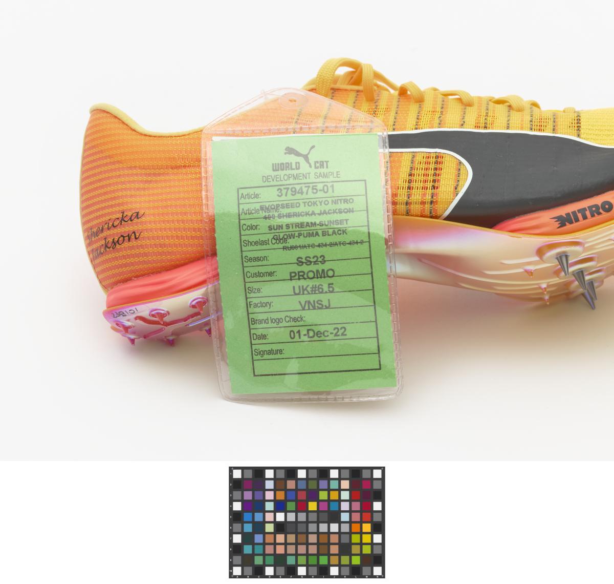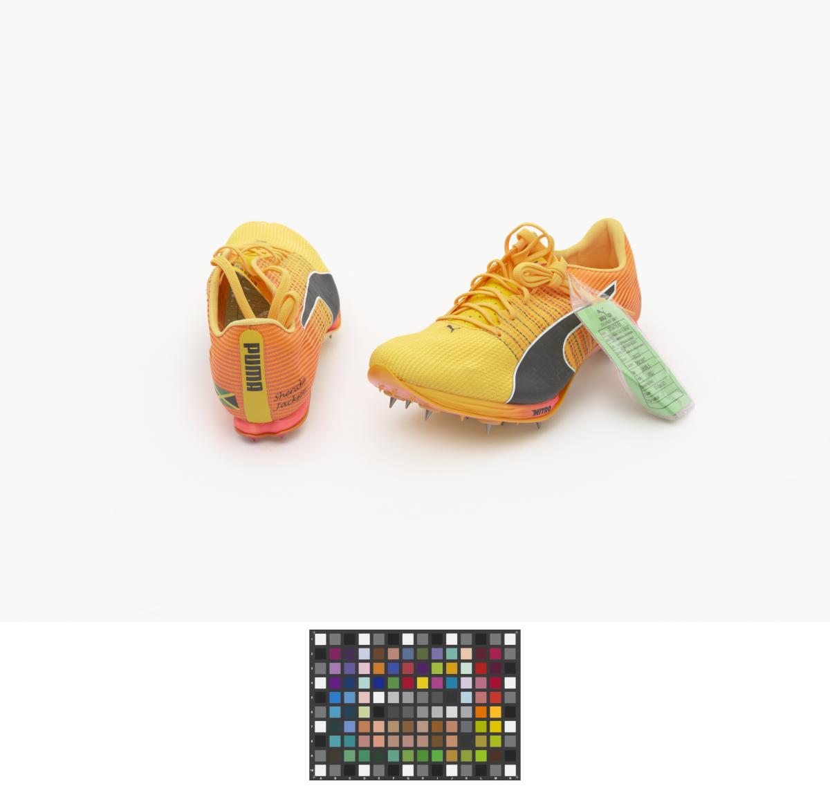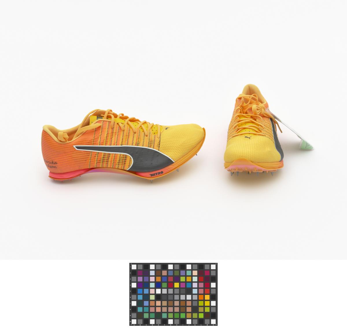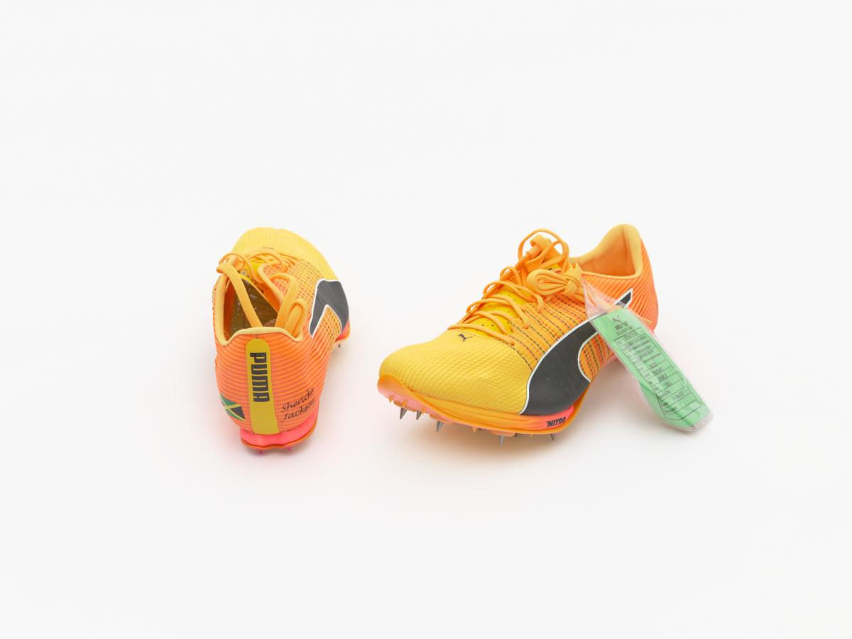 Paire de chaussures oranges et jaunes de modèle Nitro Faster+, avec le nom de l'athlète sur le côté exétrieur et le drapeau jamaïcain sur le côté intérieur.