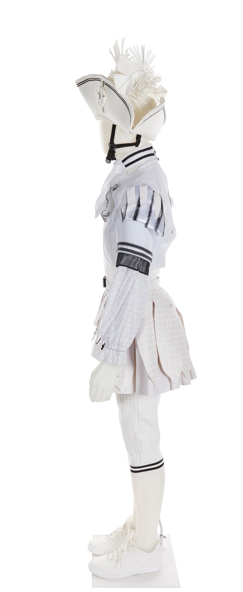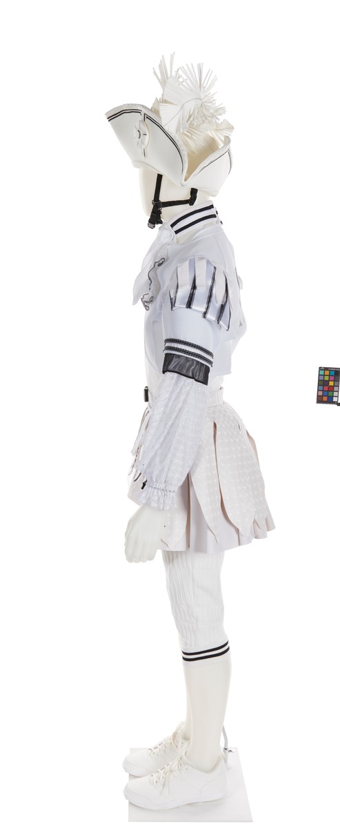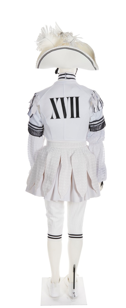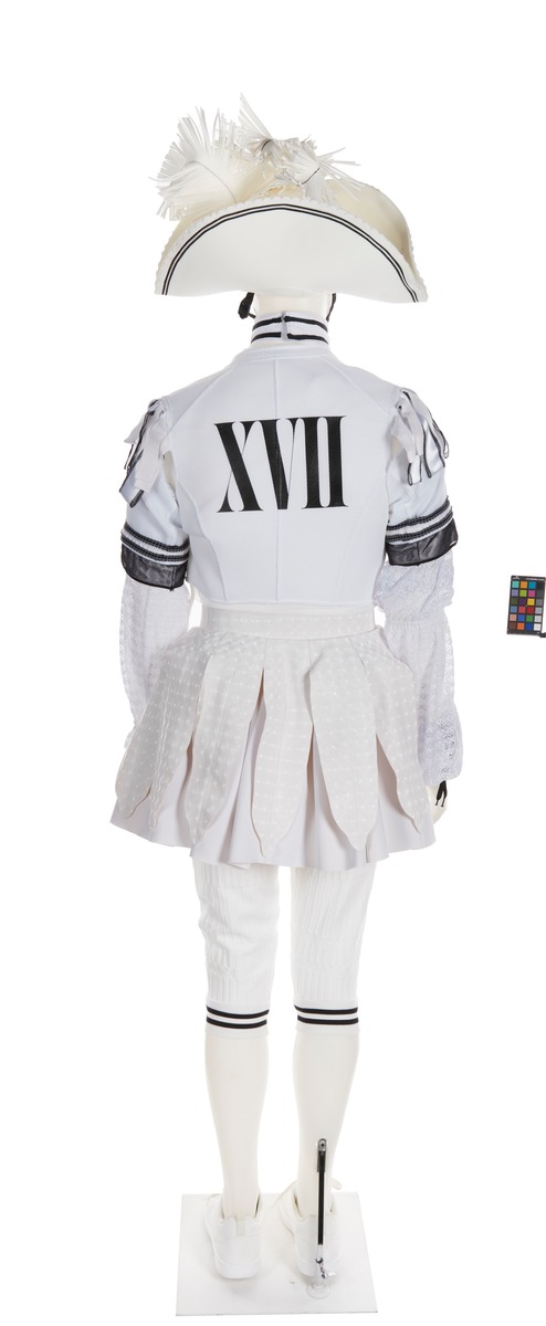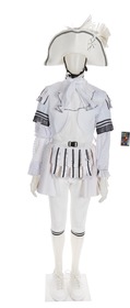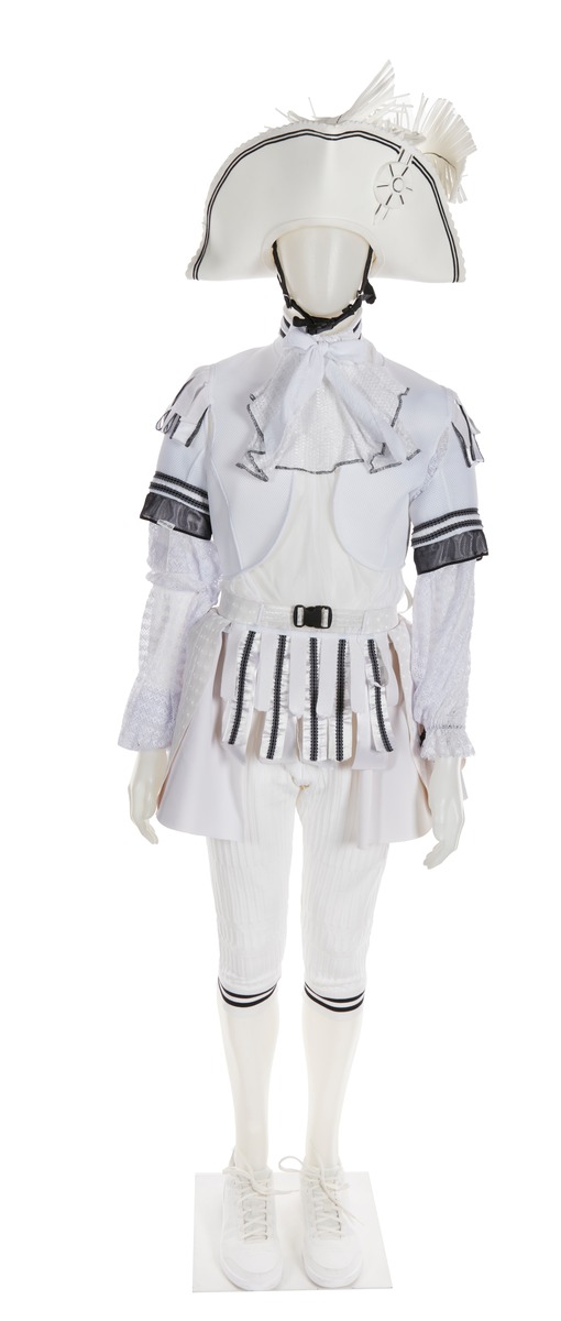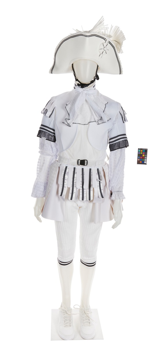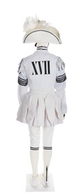 Ensemble composé d'un chapeau tricorne, d'un col, d'une chemise, d'un gilet de type pourpoint, d'une jupe, de hauts-de-chausse, de chaussettes hautes et de chaussures de sport. Costume fabriqué sur mesure à la main.