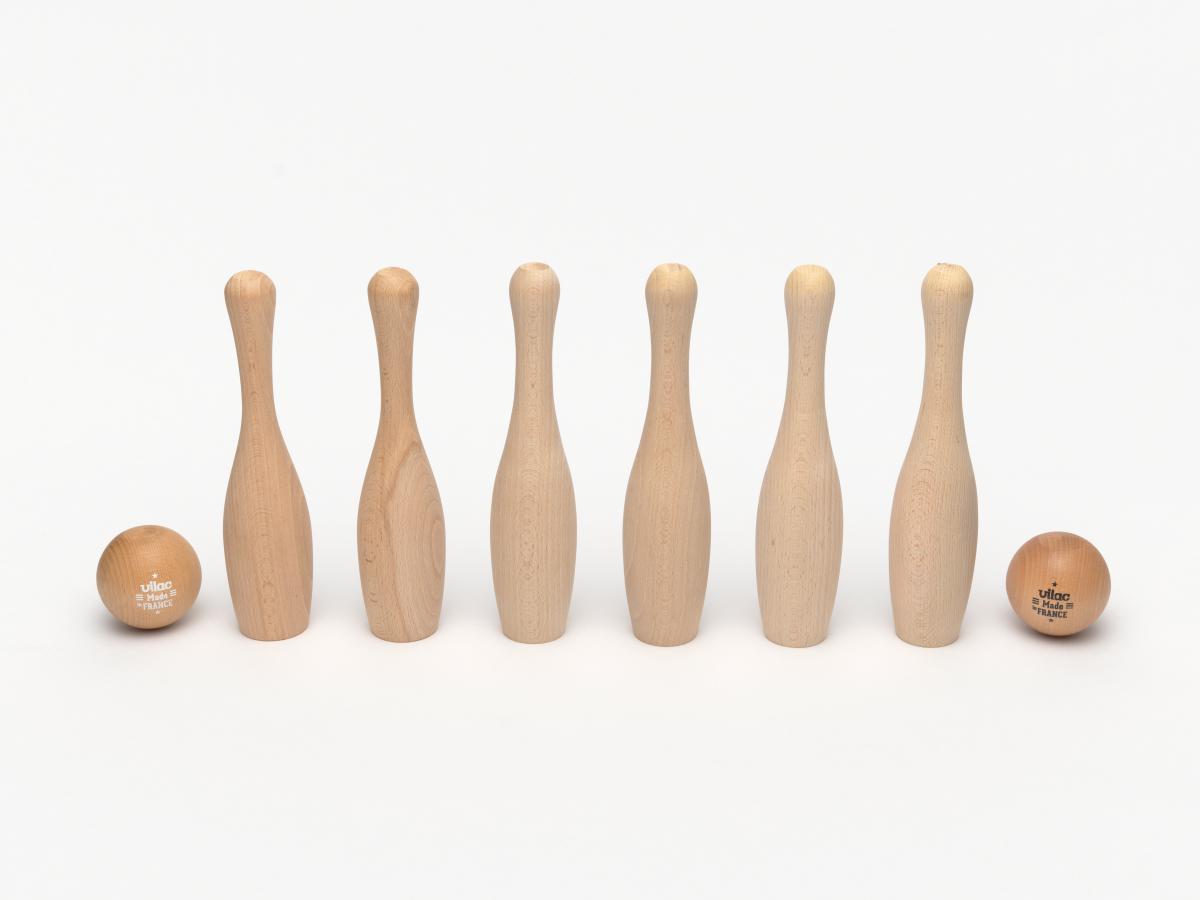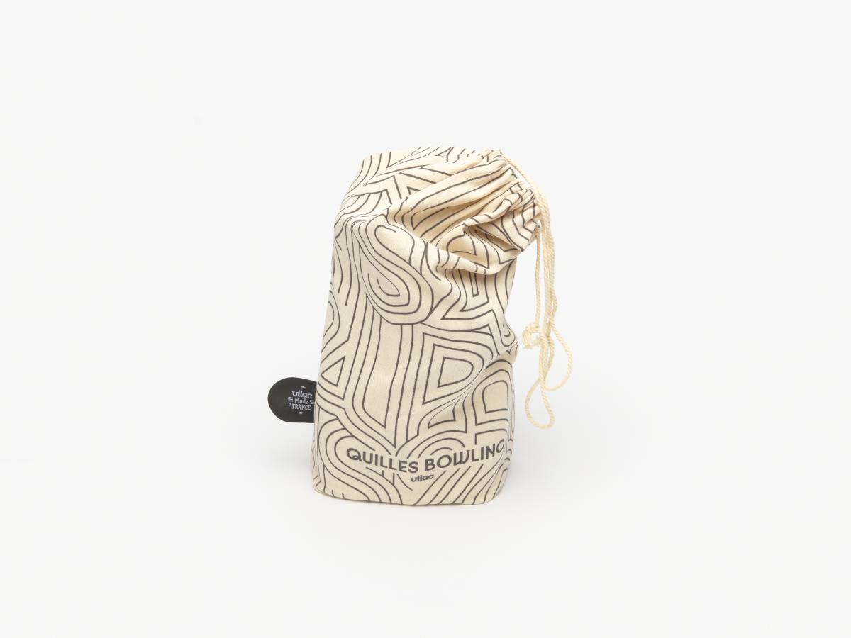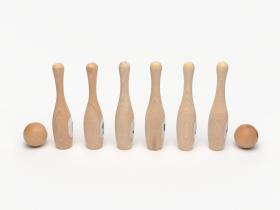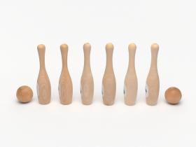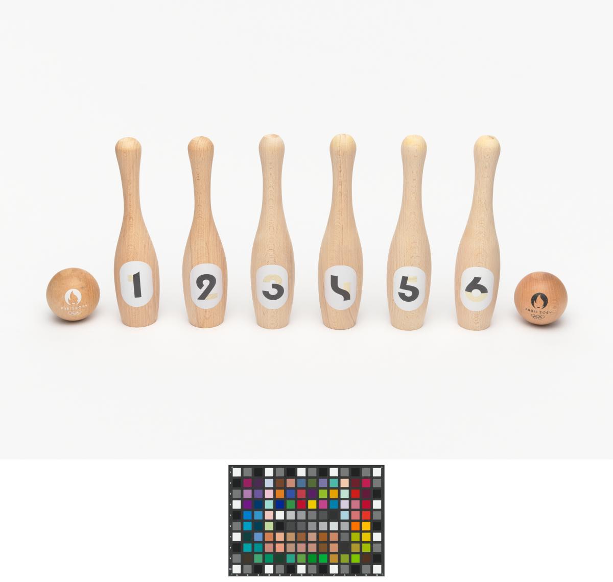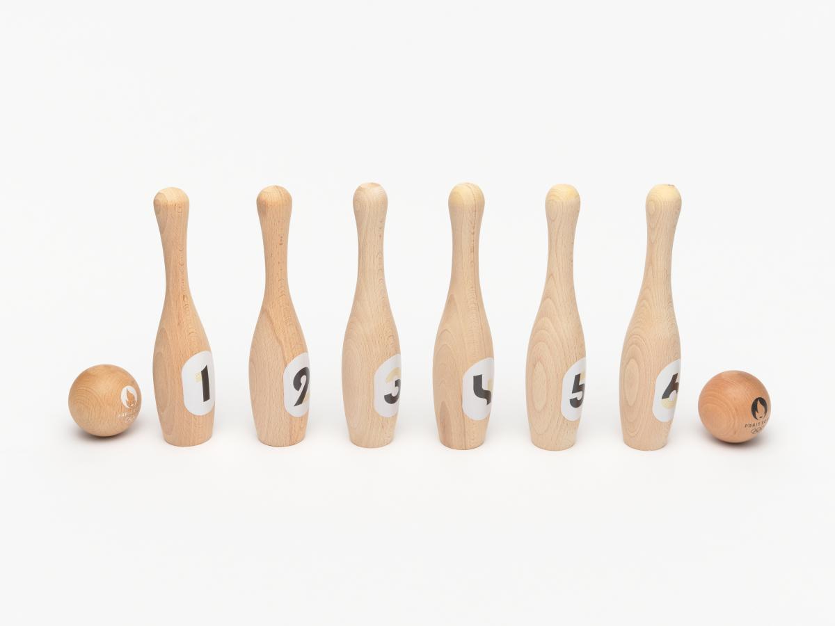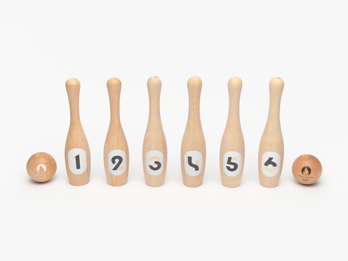 Set de 6 quilles en bois, numérotées de 1 à 6 et de deux boules arborant l'emblème des Jeux. Une en noire et l'autre en blanc. Toutes les pièces du jeu sont contenues dans un sac arborant la légende "PARIS 2024" qui suit la ligne graphique des Jeux.