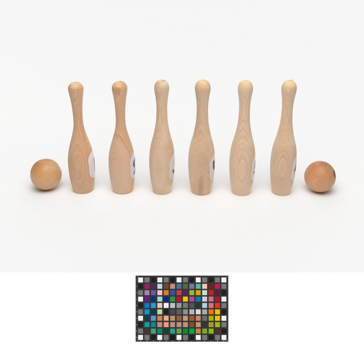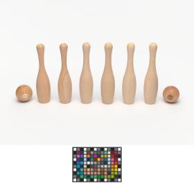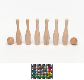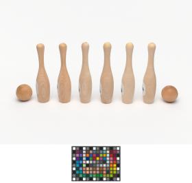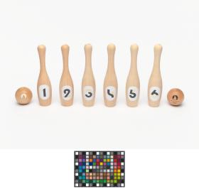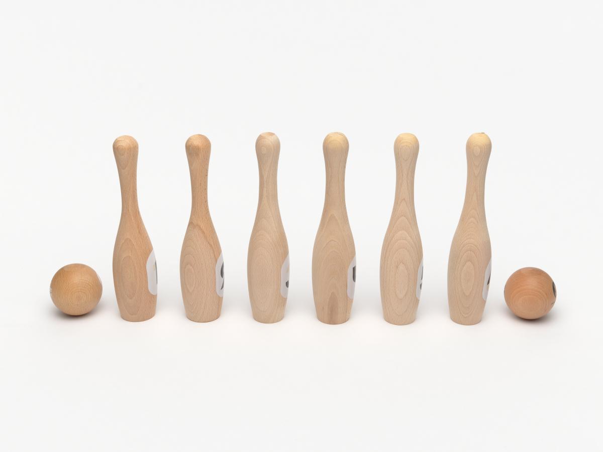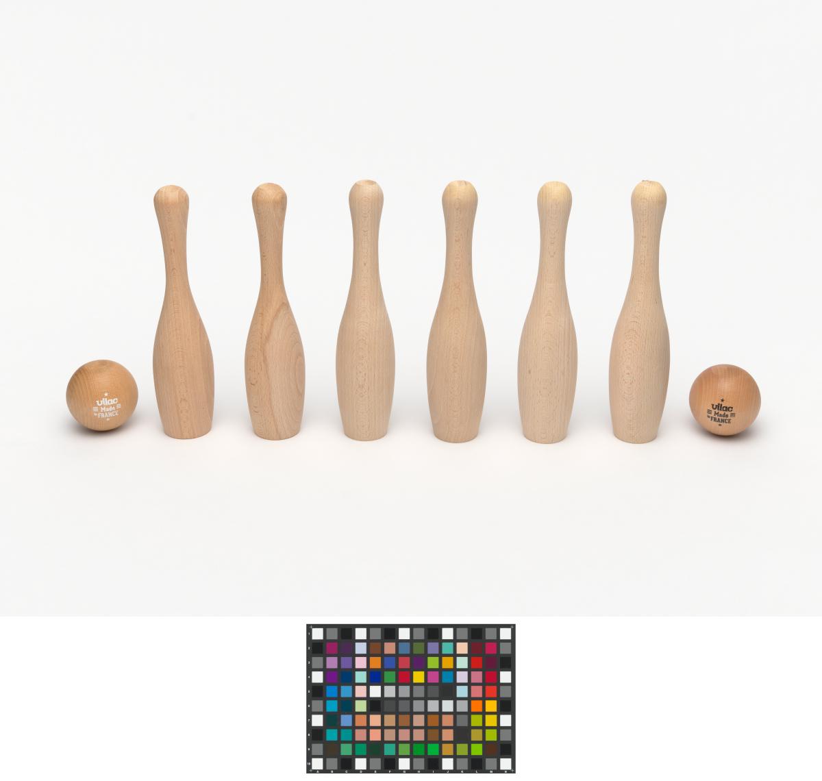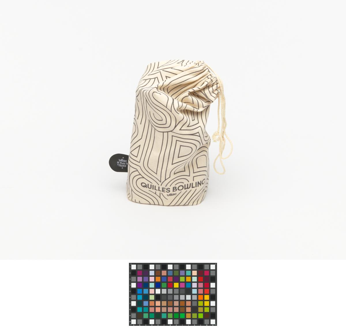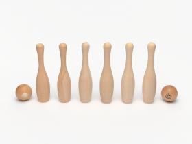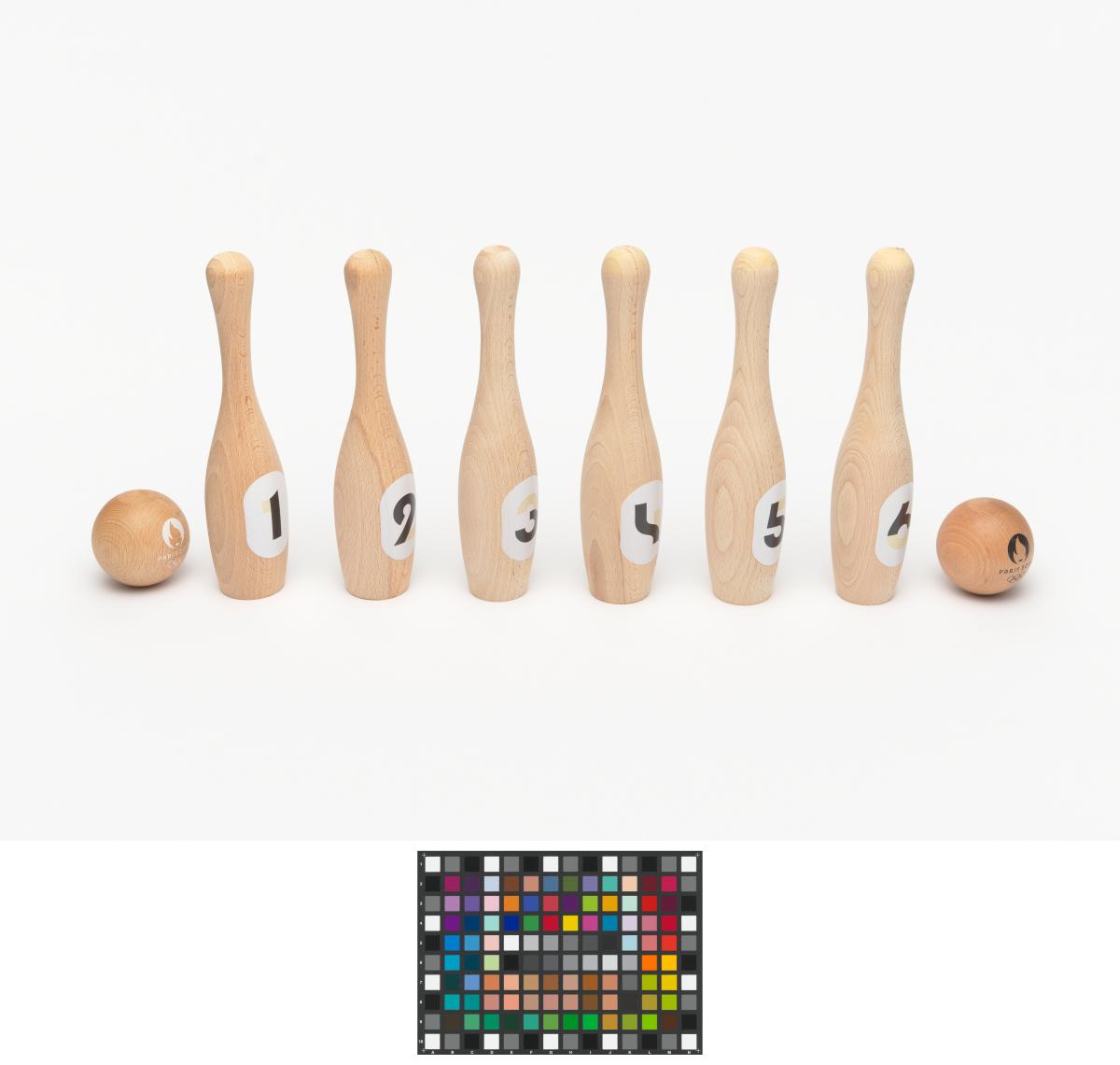 Set de 6 quilles en bois, numérotées de 1 à 6 et de deux boules arborant l'emblème des Jeux. Une en noire et l'autre en blanc. Toutes les pièces du jeu sont contenues dans un sac arborant la légende "PARIS 2024" qui suit la ligne graphique des Jeux.