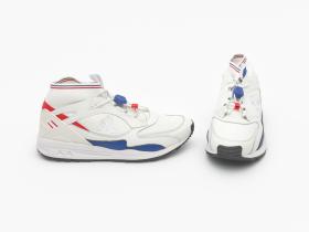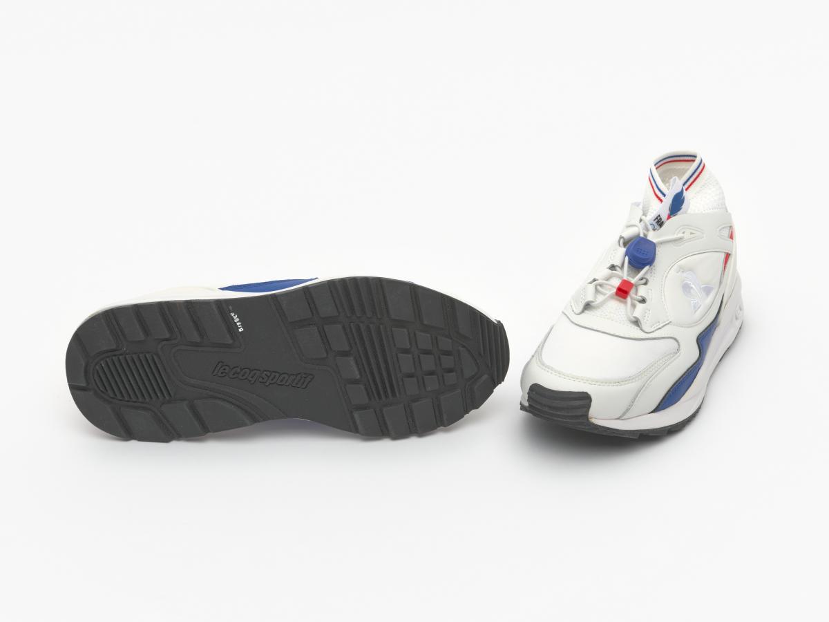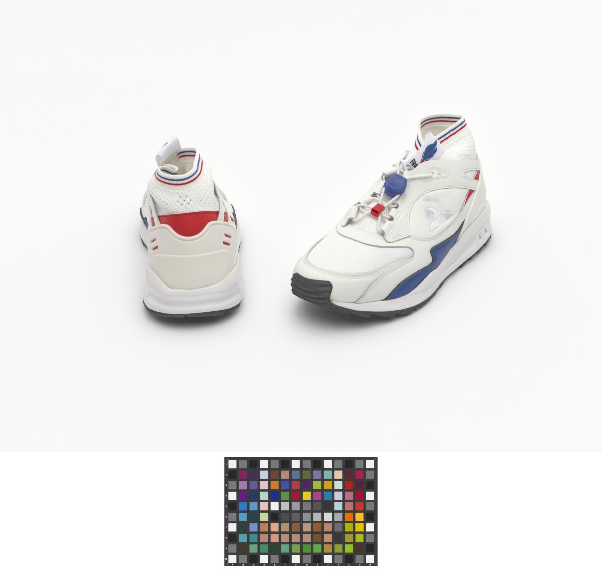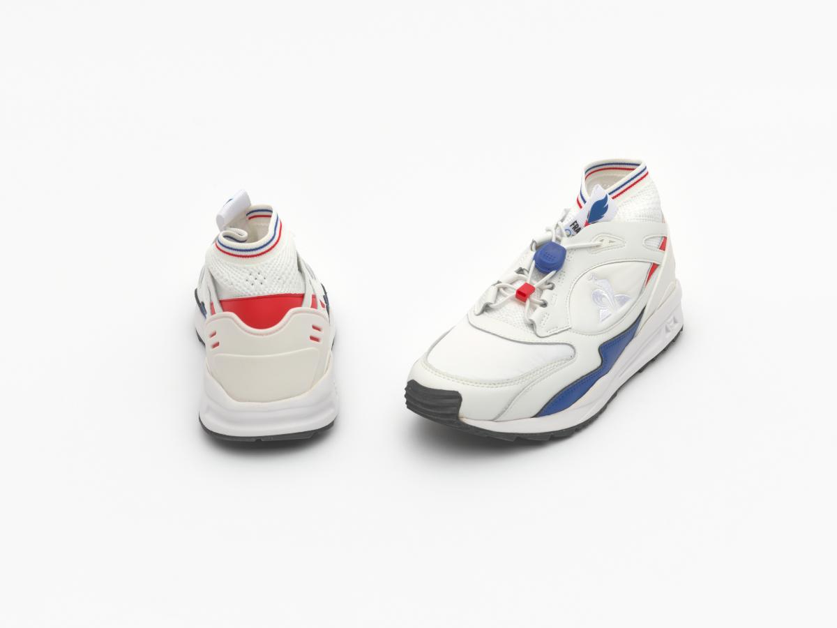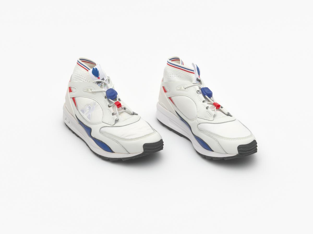 Paire de chaussures du modèle France LCS R Trail Olympics, dynamics de la marque Coq Sportif. Sur la languette, le logo de l'équipe de France, ainsi que les anneaux olympiques. Taille : 42