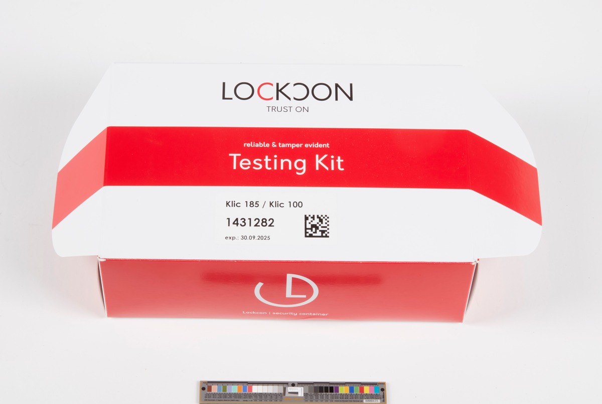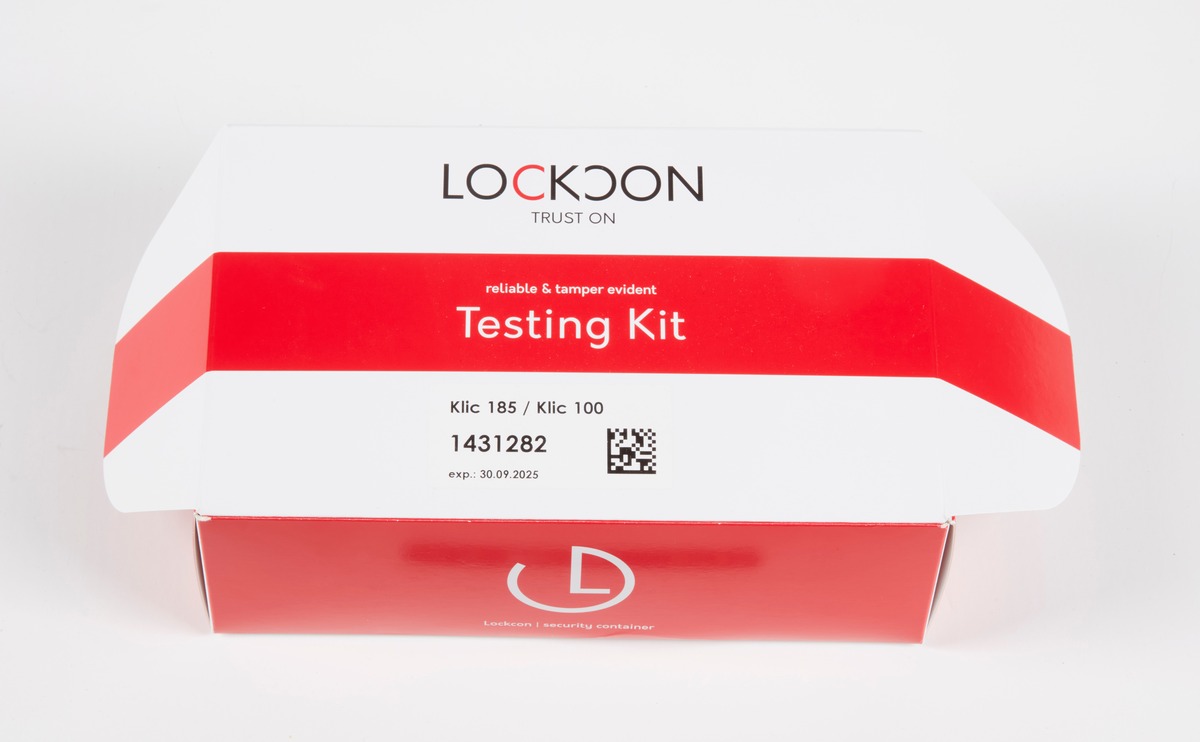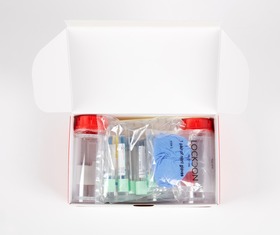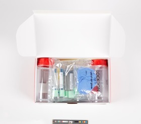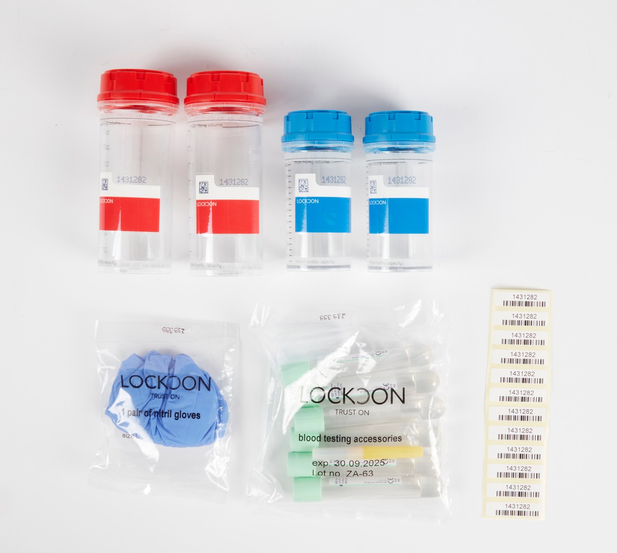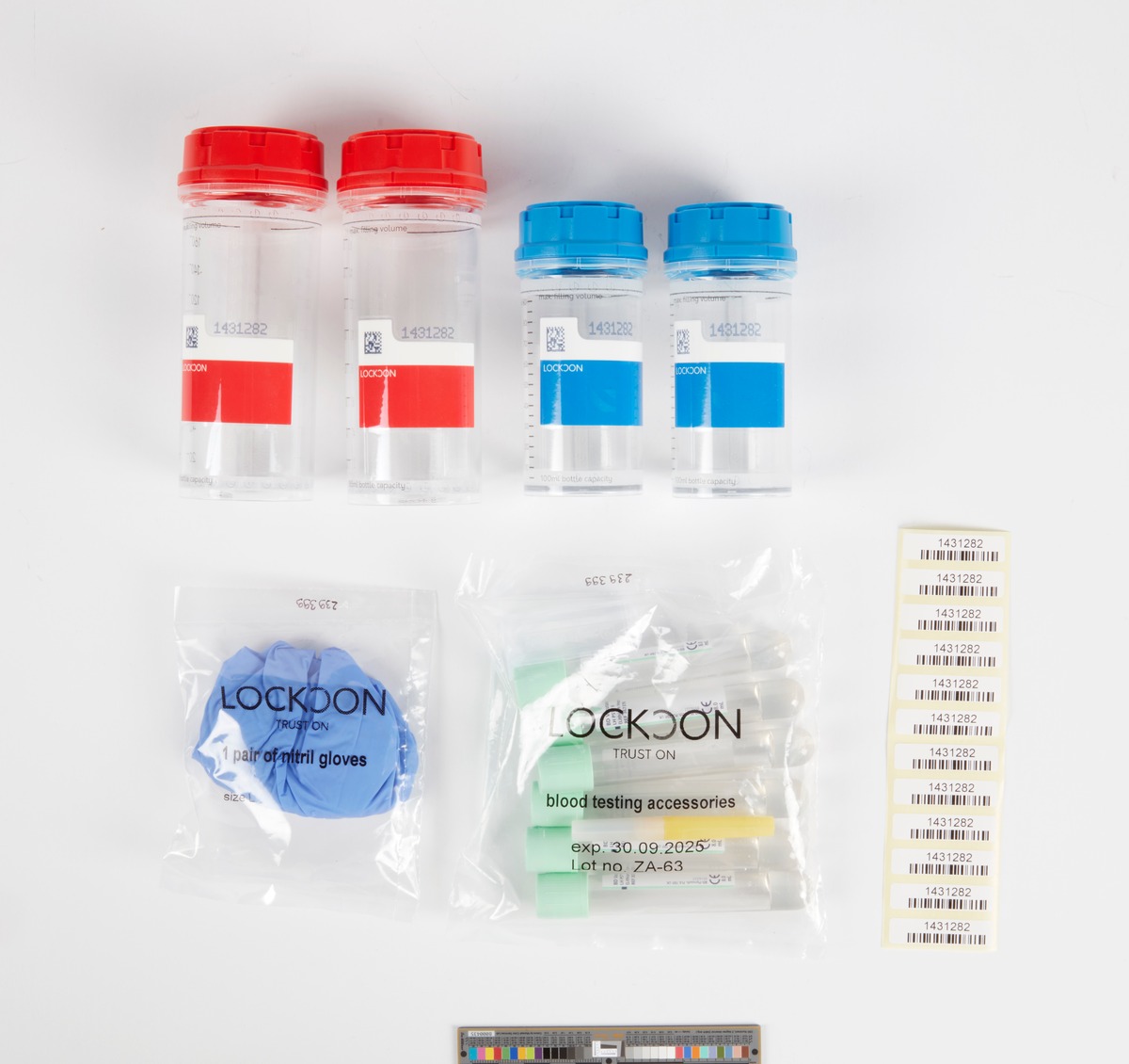 L'ensemble comprend quatre flacons en plastique dont deux flacons rouge et deux flacons bleu ainsi qu'une série de 12 étiquettes avec le même numéro de sécurité : 1431282 pour la collecte d’urine. Un sachet contenant 6 fioles pour les analyses sanguines et une paire de gants en nitrile de taille L.
