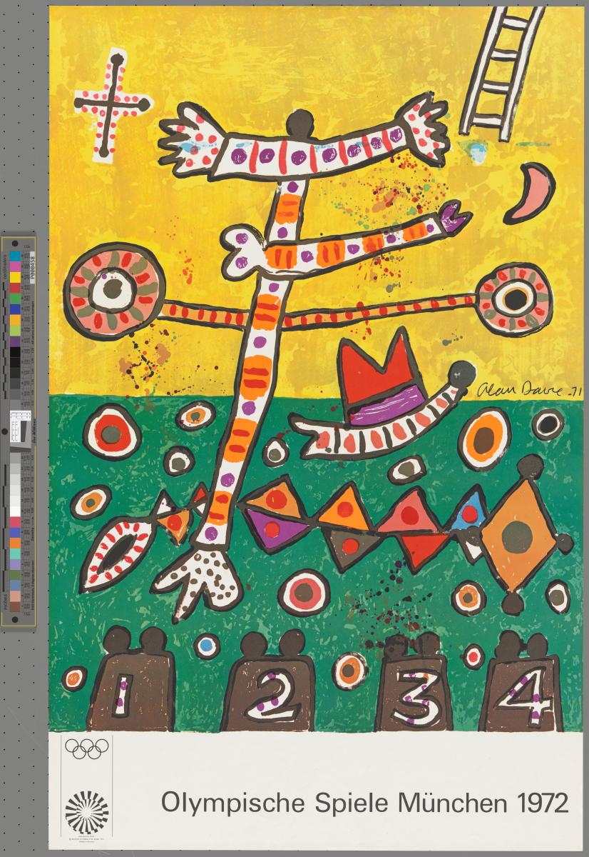 Motif abstrait très coloré. Emblème des Jeux et légende: "Olympische Spiele München 1972". Affiche signée et datée par l'artiste. Mention de copyright.