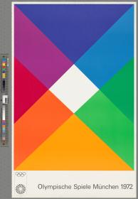 Formes géometriques colorées formant une croix. Emblème des Jeux et légende: "Olympische Spiele München 1972". Affiche signée par l'artiste. Mention de copyright.