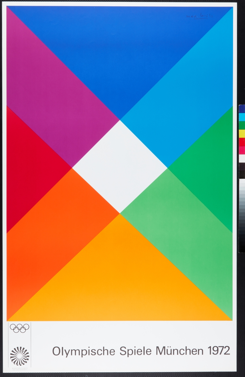Formes géometriques colorées formant une croix. Emblème des Jeux et légende: "Olympische Spiele München 1972". Affiche signée par l'artiste. Mention de copyright.