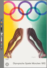 Jambes d'athlètes face à face surmontées du symbole olympique. Emblème des Jeux et légende: "Olympische Spiele München 1972". Affiche signée par l'artiste. Mention de copyright.