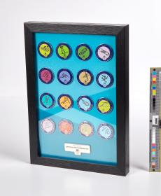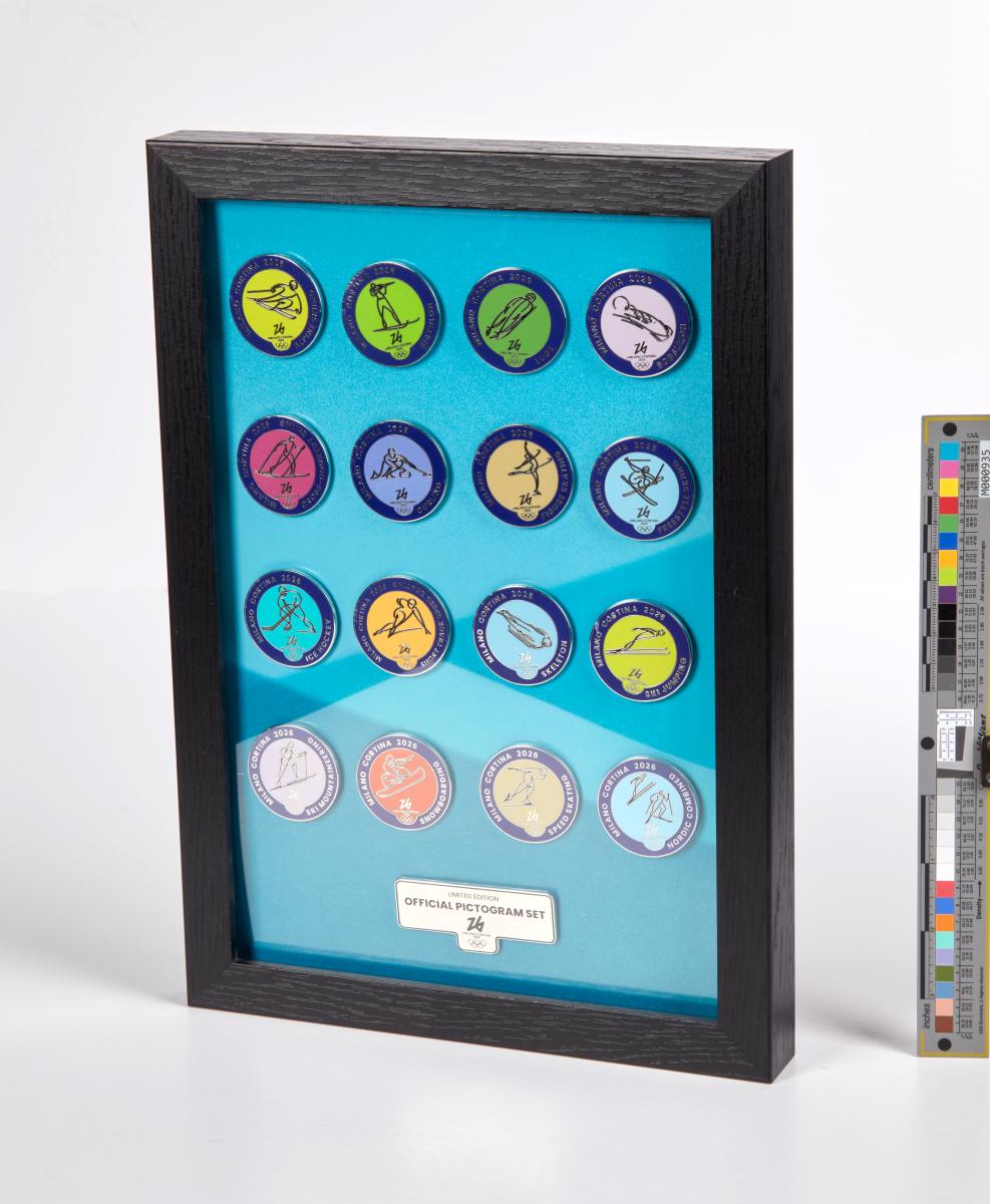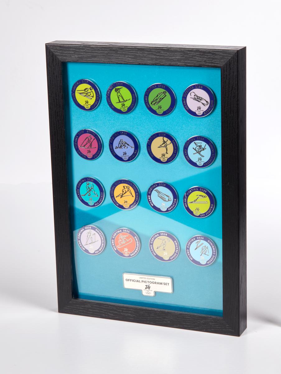Set d'insignes encadrés représentant les 16 sports d'hiver du programme olympique.