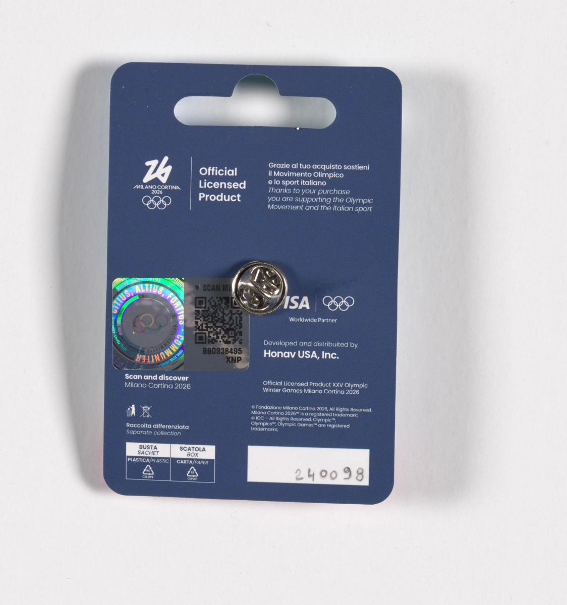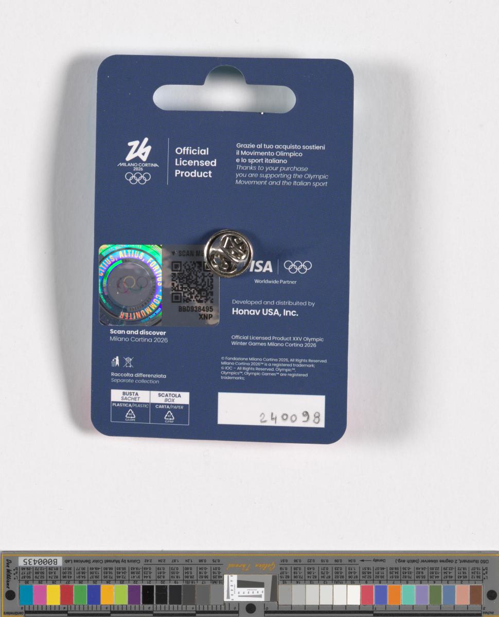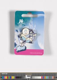 Milano Cortina 2026, insigne avec Tina, la mascotte des Jeux, faisant du patinage de vitesse.