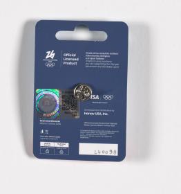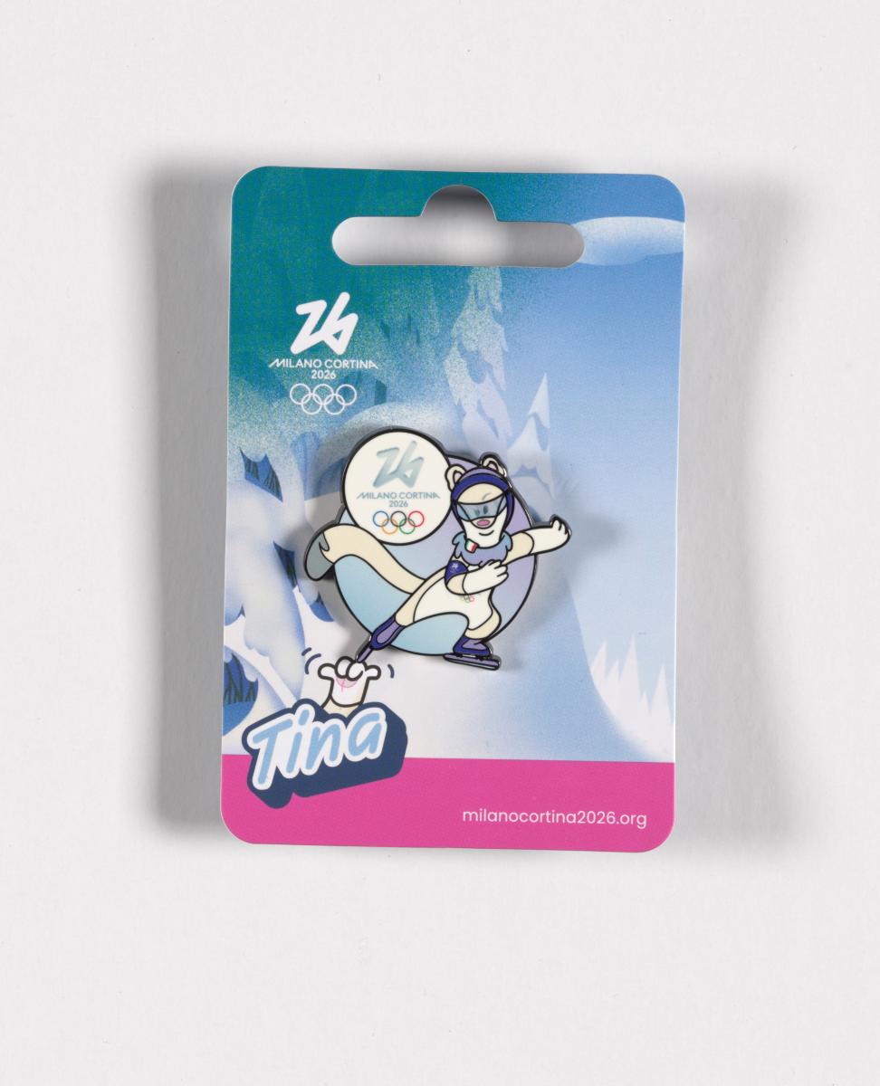Insigne représentant Tina, la mascotte de Milano Cortina 2026, faisant du patinage de vitesse. Produit de license officiel.