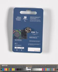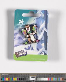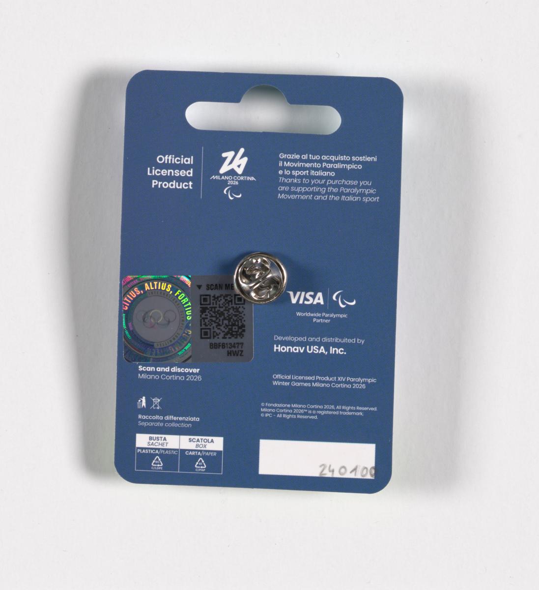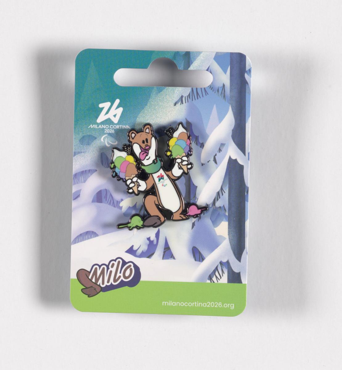 Insigne représentant Milo, la mascotte paralympique de Milano Cortina 2026, avec deux glaces. Produit de license officiel.
