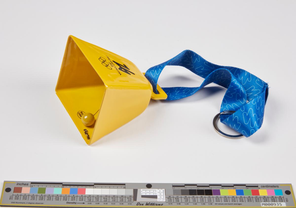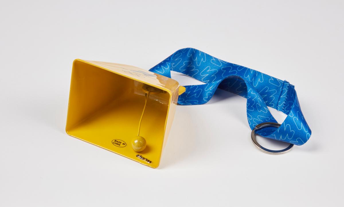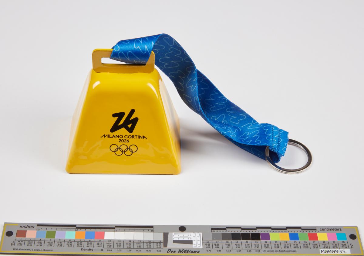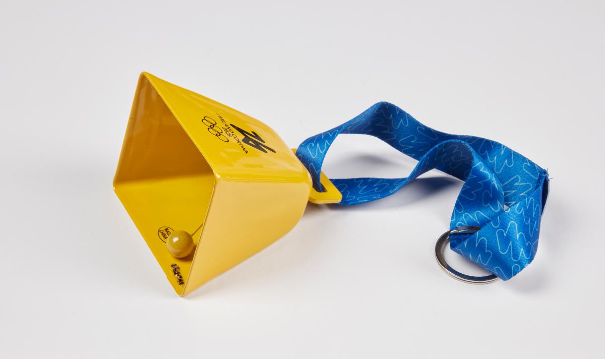 Clochette jaune avec l'emblème des Jeux de Milano Cortina 2026. Produit licencié.