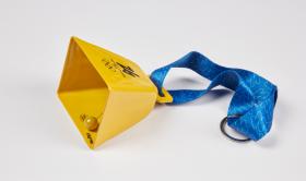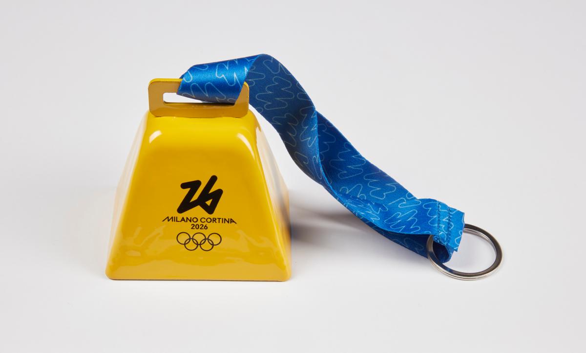 Milano Cortina 2026, clochette jaune avec l'emblème des Jeux Olympiques.