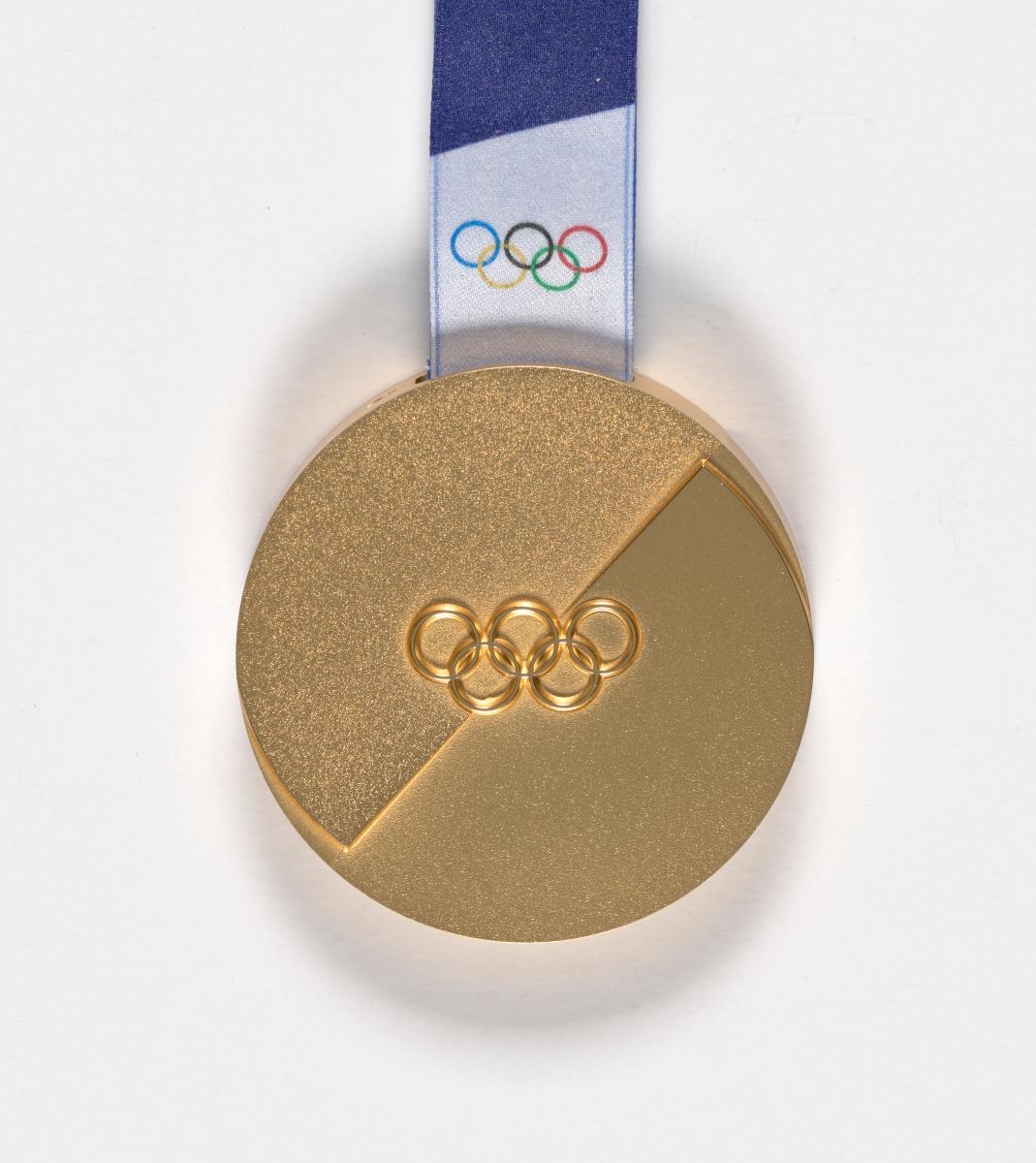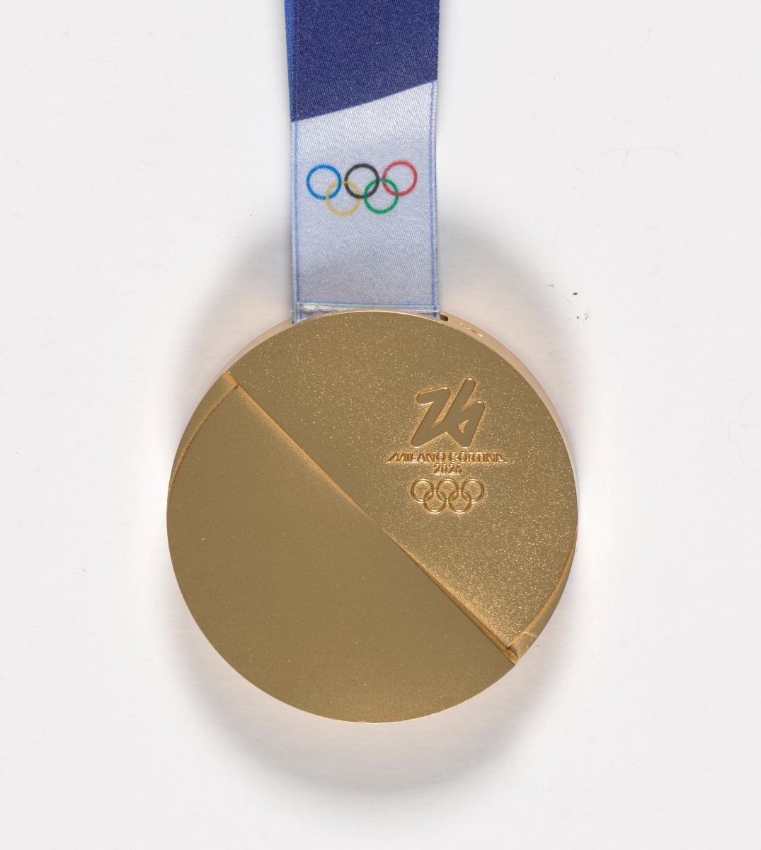 Médaille partagée en deux en diagonale sur chaque face. Avers : symbole olympique. Revers : emblème des Jeux. Légende sur la tranche : "XXV OLYMPIC WINTER GAMES MILANO CORTINA 2026".