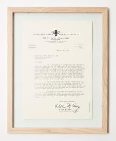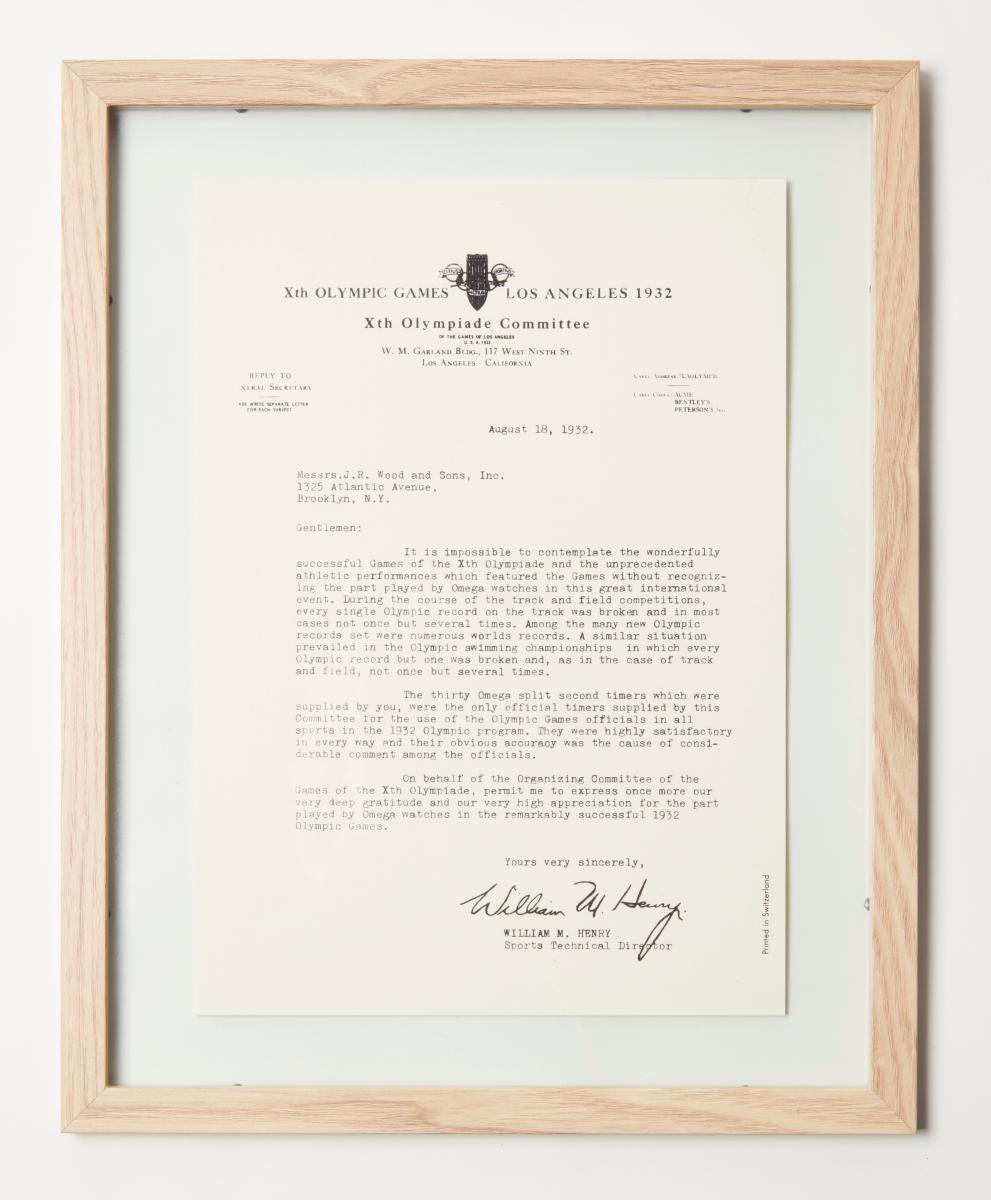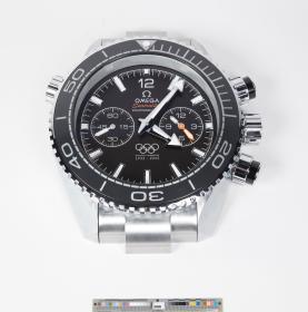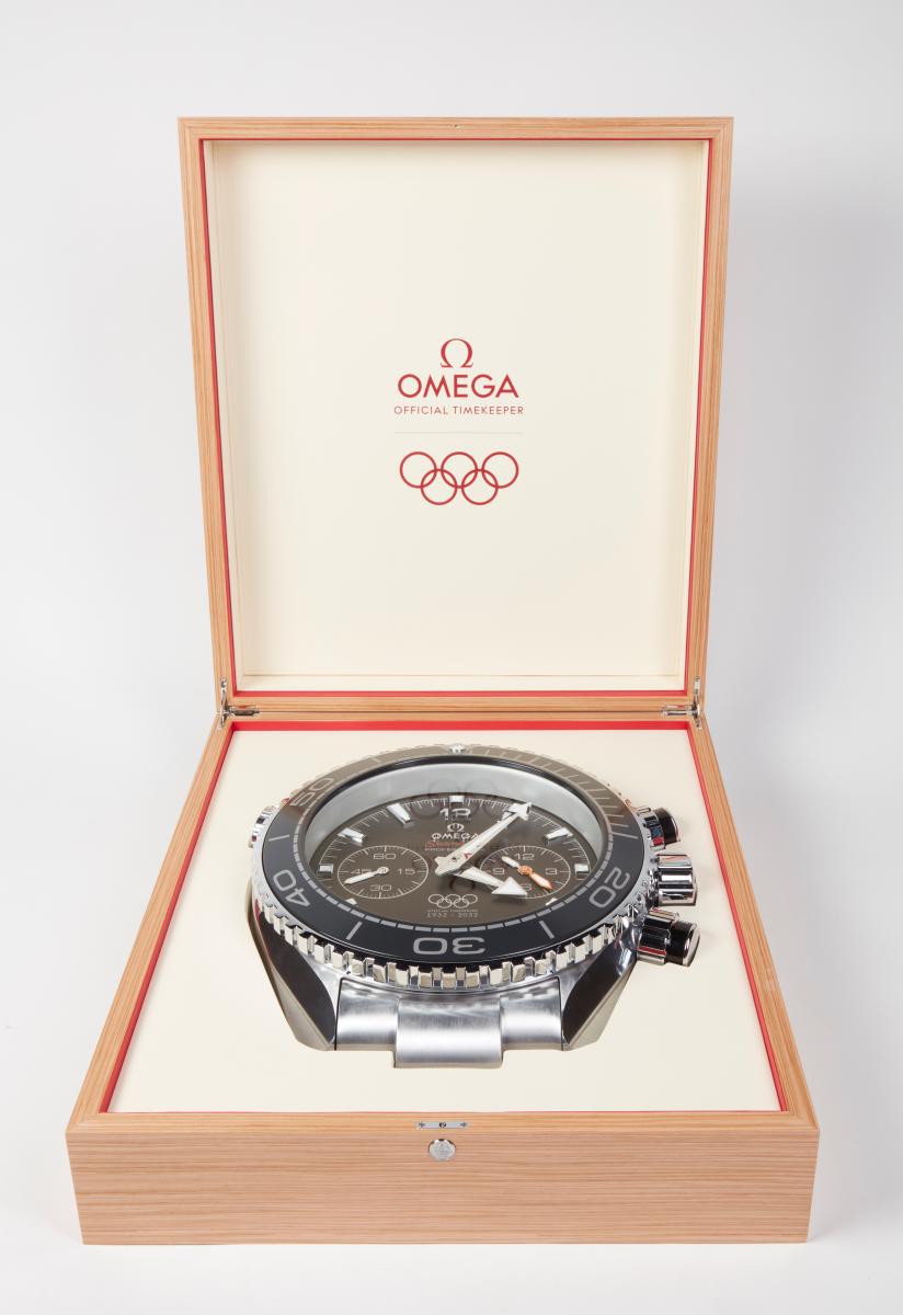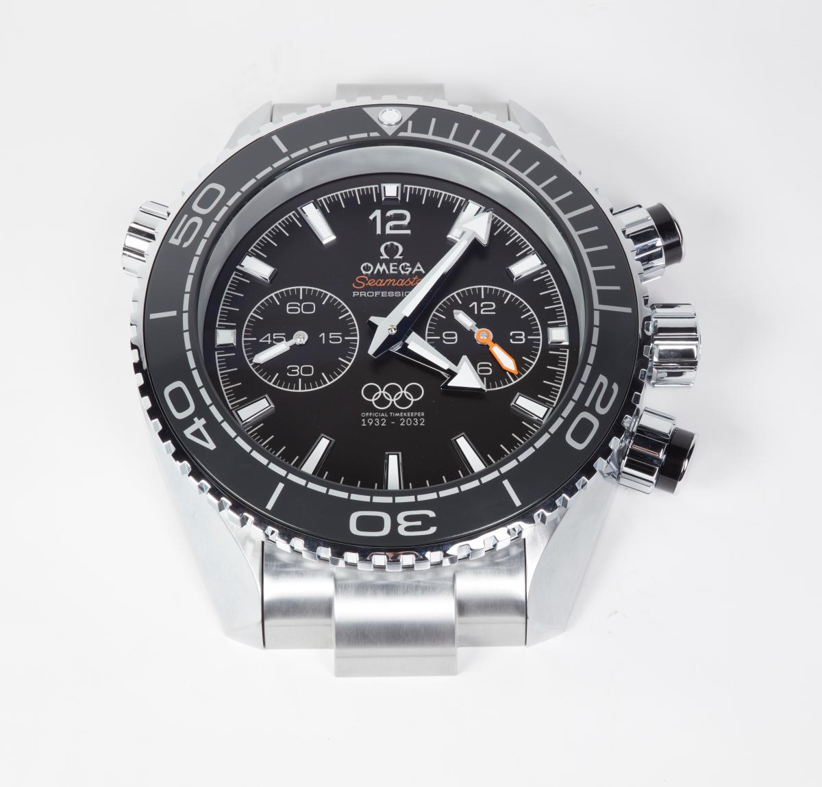 Grande horloge murale reproduisant la Seamaster Professional de Omega avec le Symbole olympique sur le cadrant avec la légende : "OFFICIAL TIMEKEEPER / 1932 - 2032".